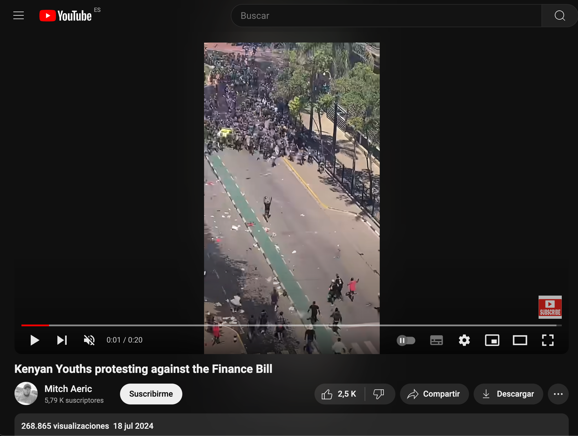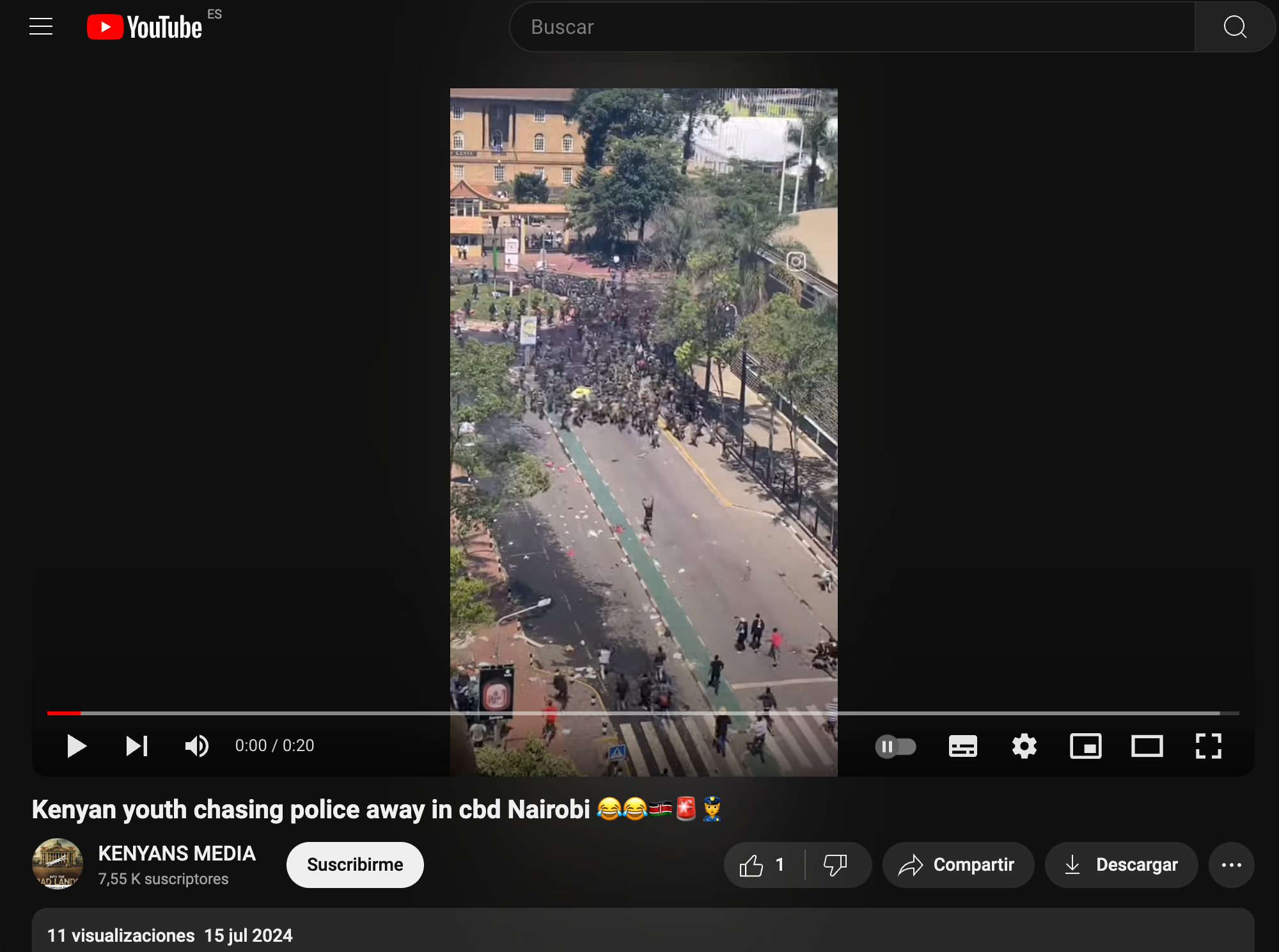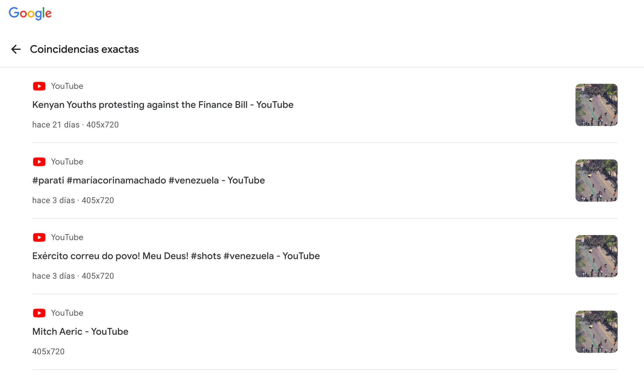 Una búsqueda inversa en Google Lens con una captura de imagen del video da varios resultados con grabaciones que ubican la protesta en Nairobi, capital de Kenia, y que fueron subidos a YouTube a mediados del mes de julio de 2024, días antes de las elecciones en Venezuela, el 28 de julio, y los posteriores disturbios. Medios internacionales informaron de que esas protestas, que se desarrollaron a finales de junio, eran por el rechazo de parte de la población a una medida legislativa que subiría los impuestos, entre otros, de alimentos y combustible. La propuesta finalmente se desestimó.