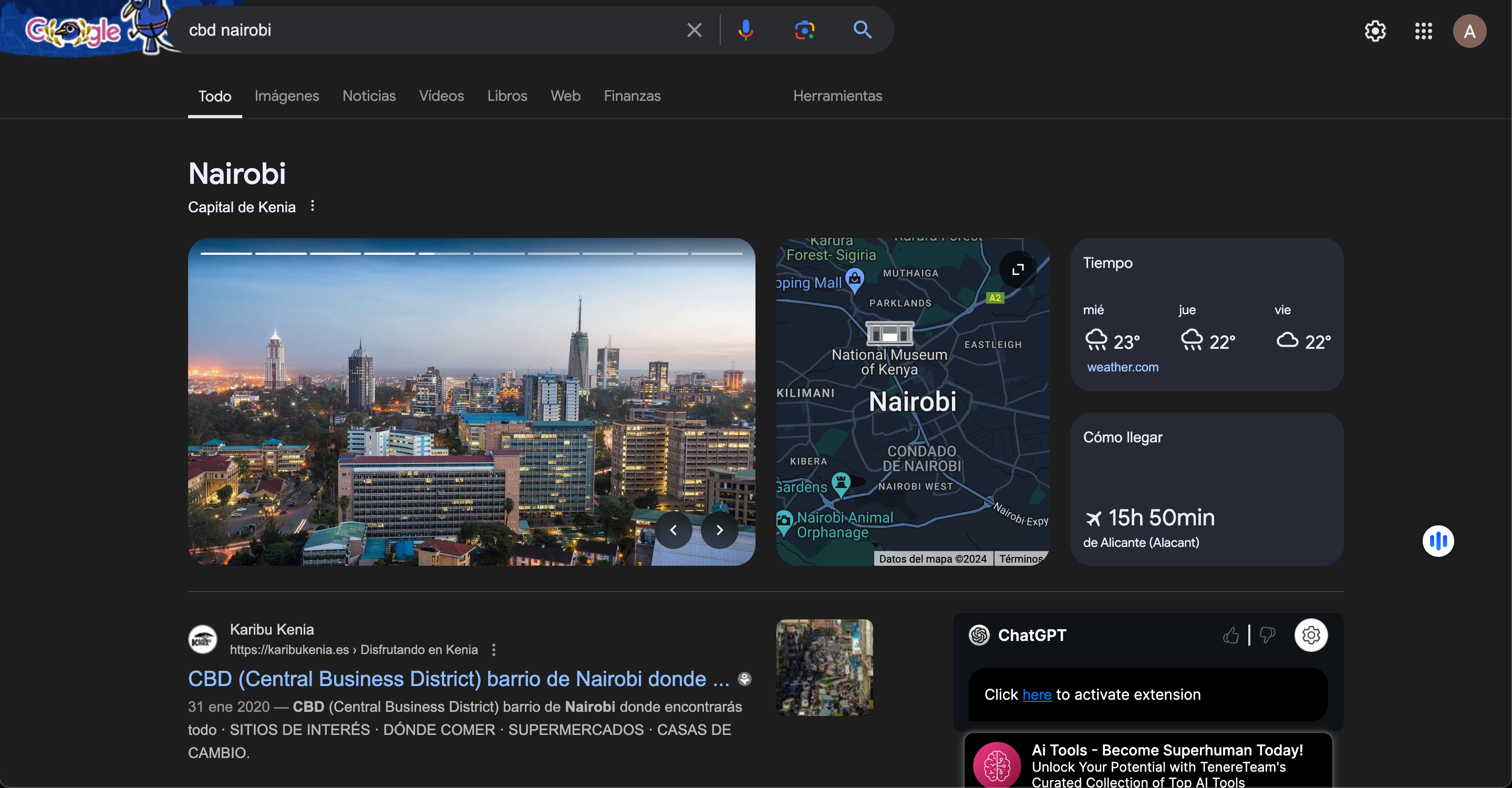 Uno de los videos que sitúa la grabación en el país africano se titula, en inglés, “jóvenes kenianos ahuyentan a la policía en el CBD de Nairobi”. Al buscar “CBD Nairobi” en Google se constata que esas tres letras significan, en inglés, distrito financiero central (Central Business District, CBD).