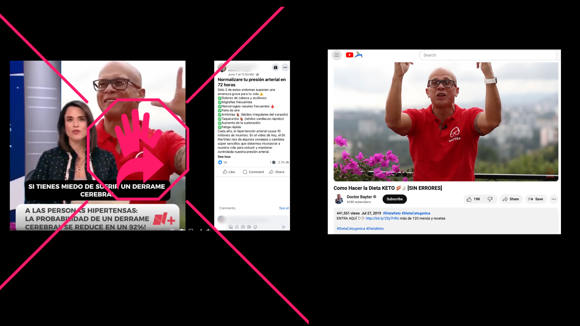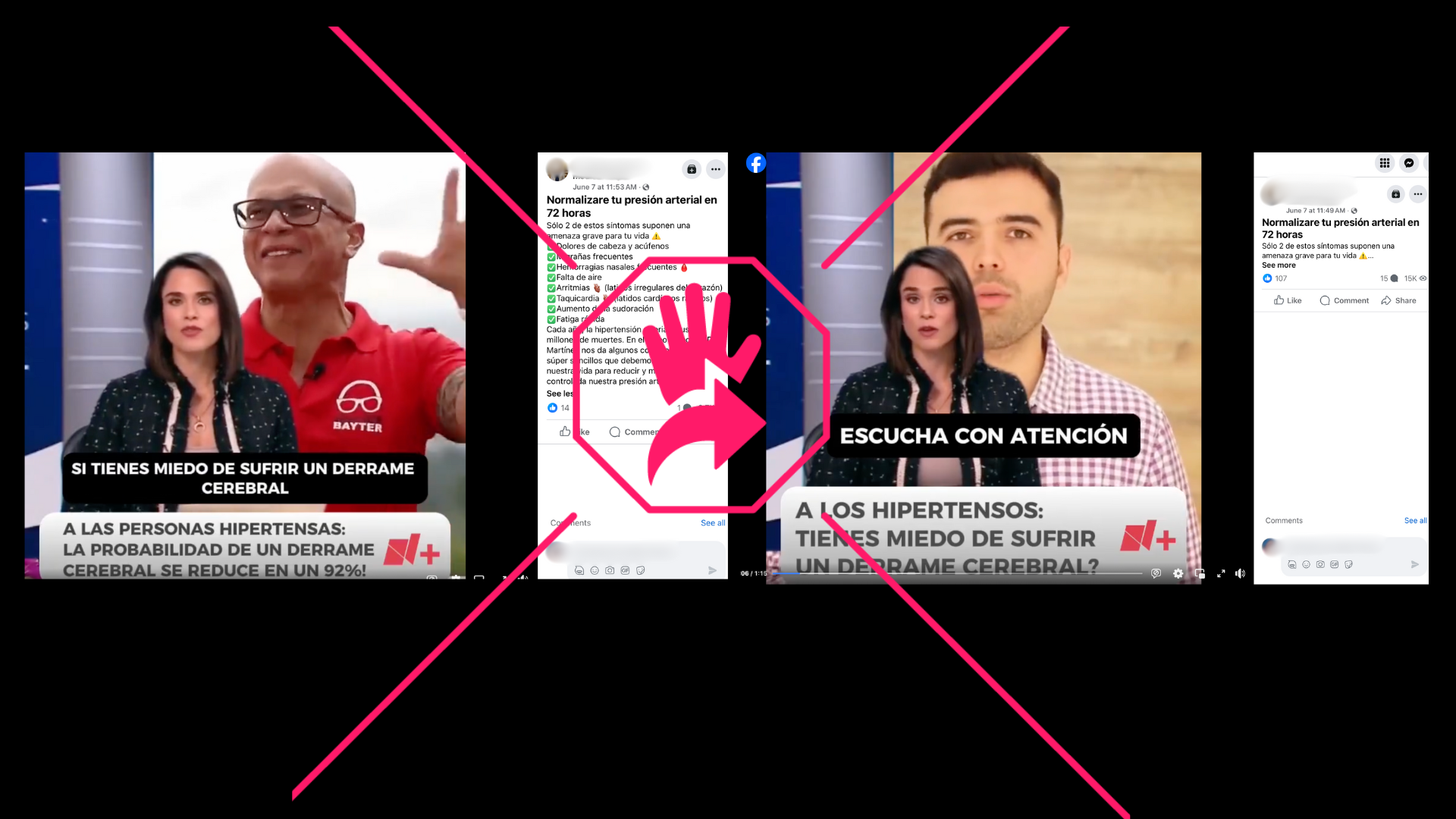 “Noticias de última hora”, dice el audio al inicio del video, donde se ve a Landivar supuestamente garantizando que “normalizarás tu presión arterial en 72 horas” con un presunto “medicamento” que se puede encontrar en su “sitio web oficial”. El mismo audio se escucha en el clip en el que aparece Bayter.