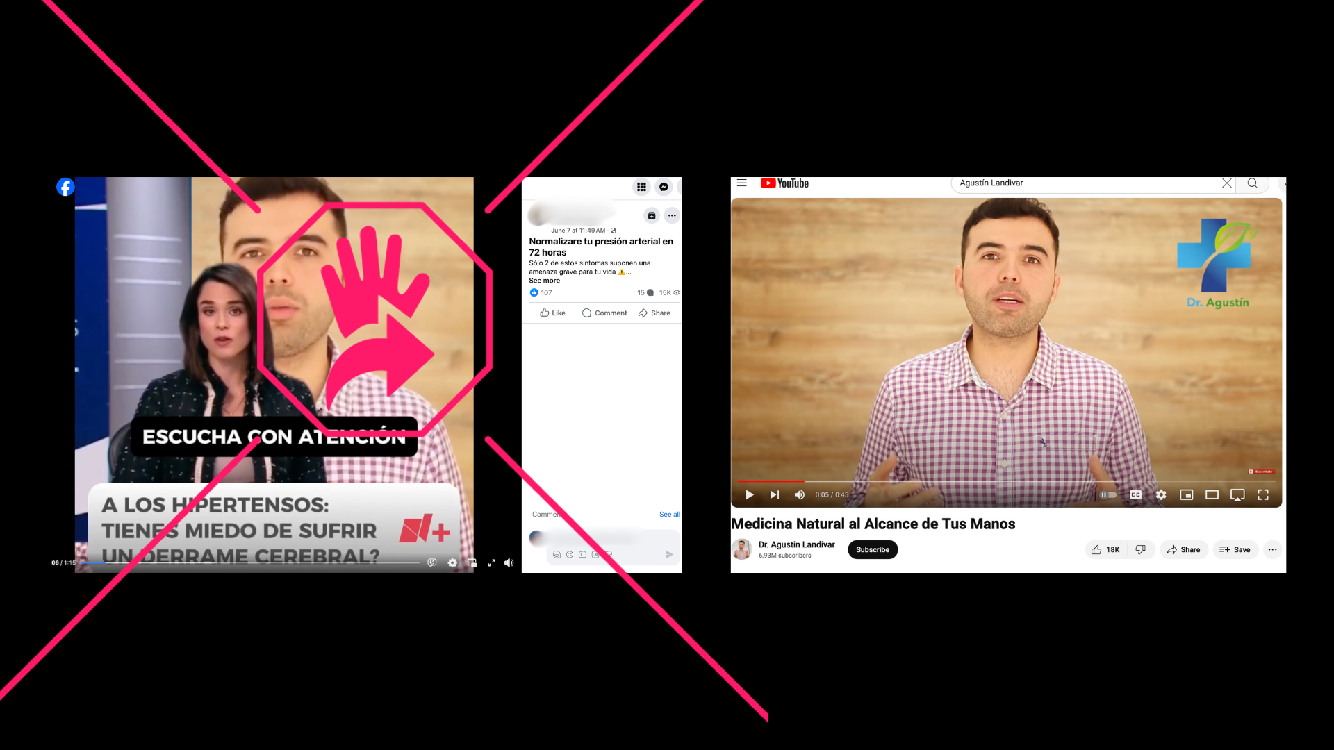 Es falso que los médicos Agustin Landivar y Jorge Bayter promovieron un producto que normalice la presión arterial en “72 horas”, como se sugiere en videos difundidos en Facebook. En elDetector comprobamos que estos fueron manipulados y no pertenecen a un segmento televisivo. El video original de Landivar, publicado en 2018 en su cuenta oficial, no menciona ningún “medicamento” para la presión arterial, sino que trata sobre curar las enfermedades de forma natural. Asimismo, en el video original de Bayter publicado en Youtube, él habla sobre la dieta keto y el metabolismo, sin hacer referencia a medicamentos para la presión arterial. Lee aquí cómo escogemos y asignamos nuestras etiquetas en elDetector.