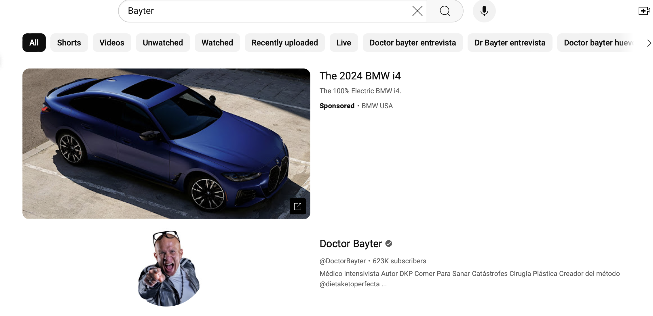 De la misma forma, buscamos en YouTube el apellido Bayter y hallamos la grabación original difundida en julio de 2019 en la cuenta del médico, que tiene más de 623,000 suscriptores. En este video, se observa a Bayter con la misma camiseta roja con su logo a la mano derecha y el encuadre es idéntico.