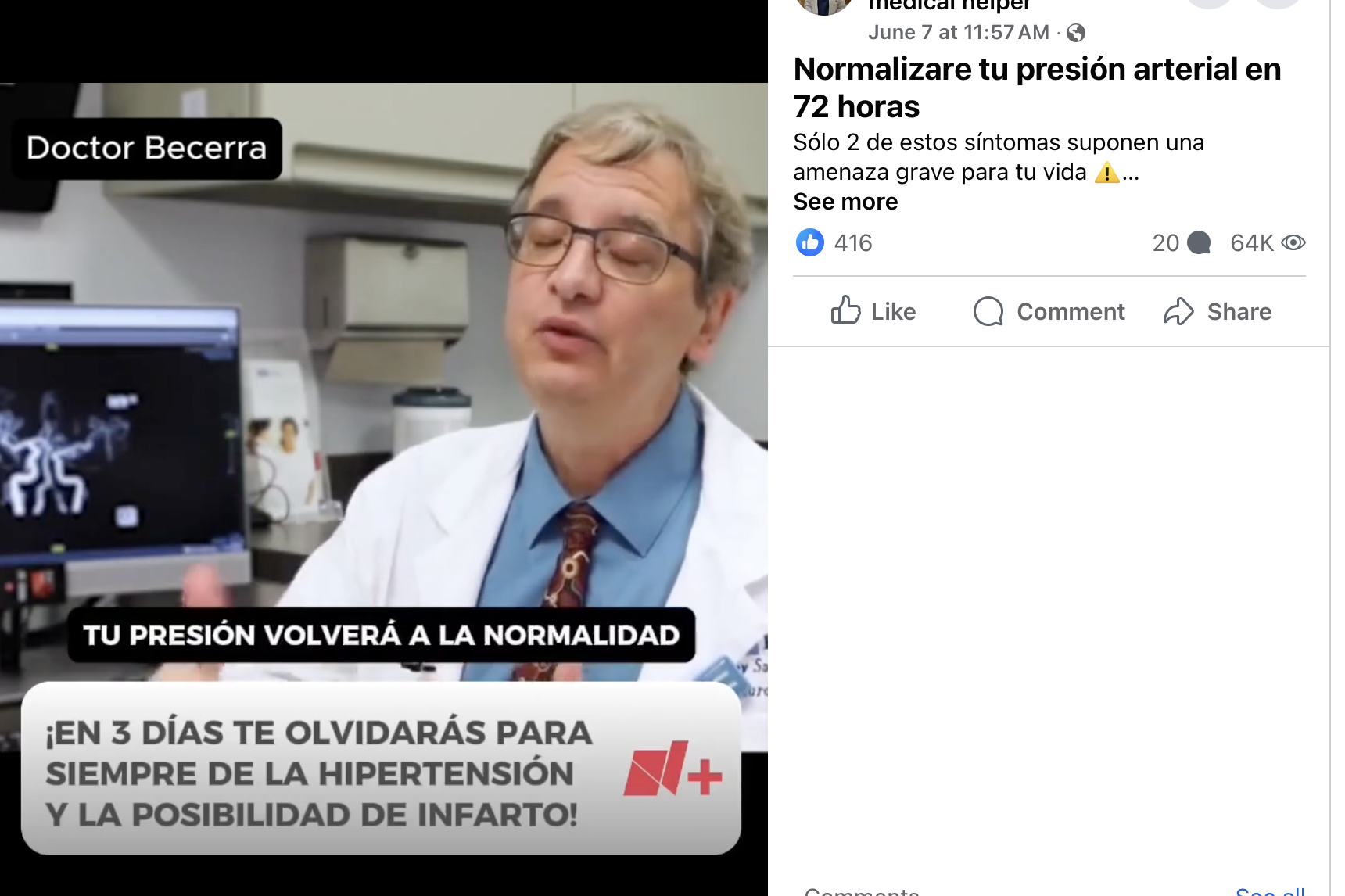 Son falsos esos anuncios en los que populares médicos parecen promover un producto para normalizar la presión arterial en “72 horas”