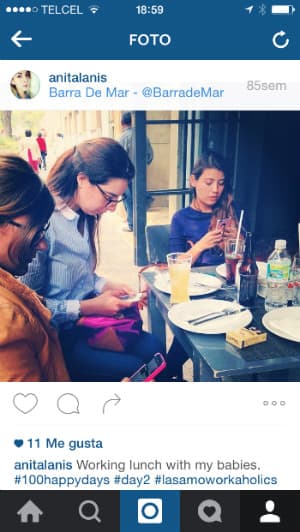 #Day2: “ Working lunch with my babies ”, dice el pie de foto. Nadie toca sus platillos, todas miran fijamente sus celulares y yo aparento ser feliz porque me toca trabajar a la hora de la comida.