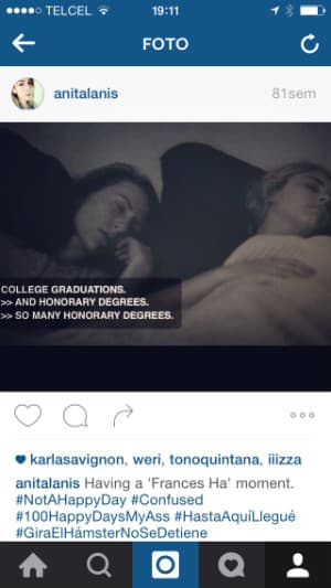 #Day8: # NotAHappyDay # Confused # 100HappyDaysMyAss # HastaAquíLlegué . Una escena de la película independiente Frances Ha , en donde la protagonista le pregunta a su mejor amiga, visiblemente abrumada, qué demonios va a hacer de su vida.