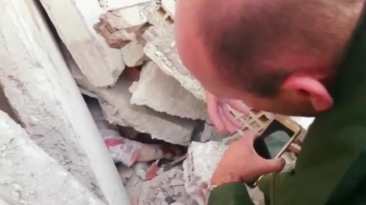 Bajo los escombros, un oficial consuela a un sobreviviente del terremoto en Italia