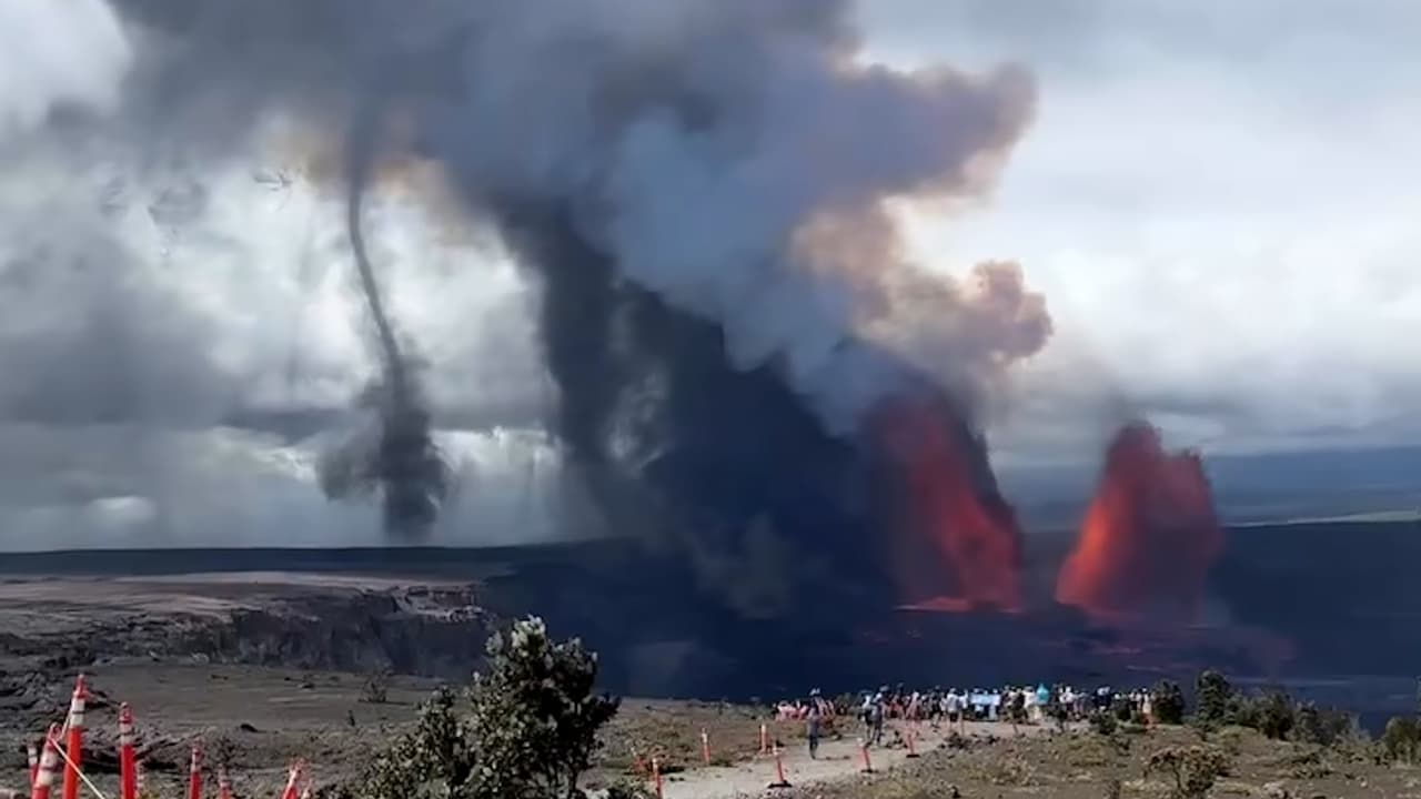 El fin de semana, turistas que visitaban el Parque Nacional de los Volcanes de Hawaii, pudieron apreciar la conjunción de un tornado de humo y ceniza junto a las columnas de lava que llegaron a los 1,000 pies de altura.