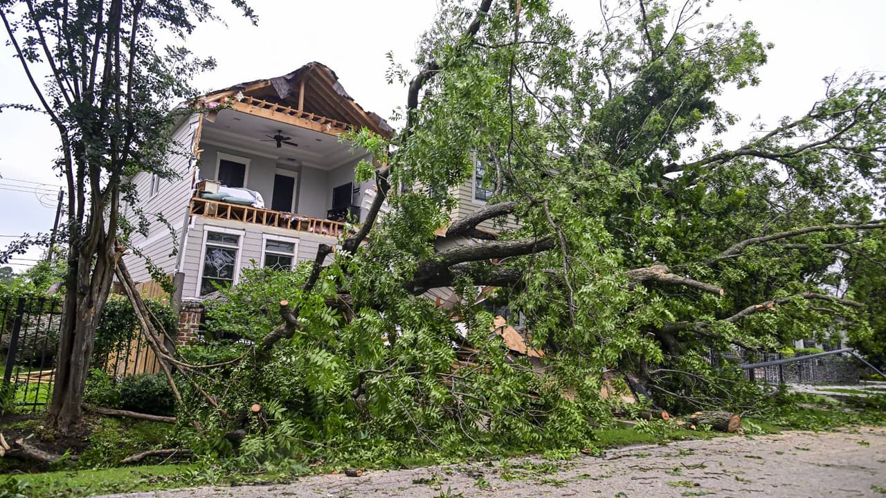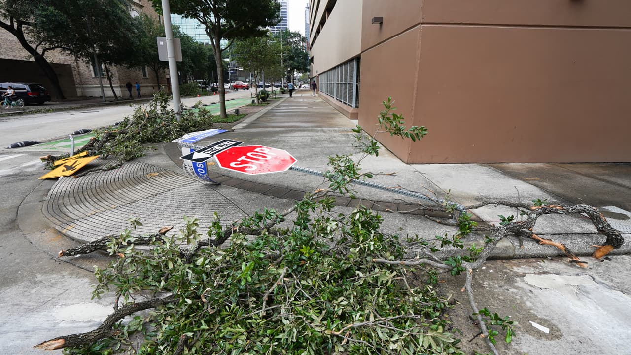 La destrucción generalizada paralizó gran parte de Houston. Árboles, escombros y cristales rotos cubren las calles. Una pared de ladrillos de un edificio fue arrancada por la fuerza del temporal.
