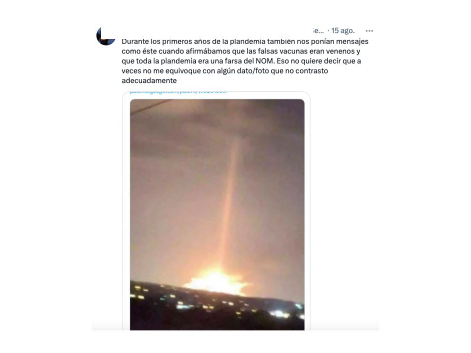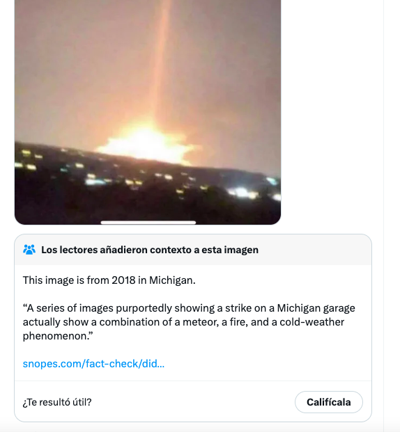 En elDetector hicimos una búsqueda inversa de imagen en Google que nos llevó a una verificación publicada por Snopes el 10 de agosto de 2023, que a su vez hace referencia a otro chequeo previo que este mismo sitio hizo en enero de 2018 sobre la fotografía. En ambos se explica que la imagen “es una de las tantas que documentan una quema controlada que ocurrió en una refinería de Ohio” ese año, a la vez que se detalla que el aparente “haz de luz” que se observa responde a un fenómeno visual que ocurre en climas fríos y se denomina “pilares de luz”.