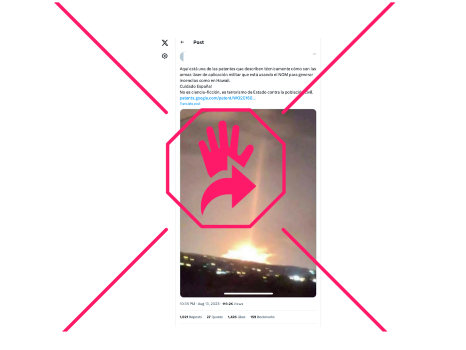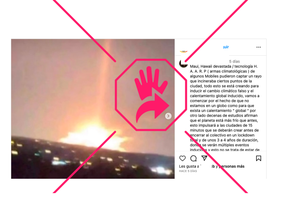 “Maui, Hawaii devastada / tecnología H. A. A. R. P (armas climatológicas) de algunos Mobiles [sic] pudieron captar un rayo que incineraba ciertos puntos de la ciudad, todo esto se está creando para inducir el cambio climático falso y el calentamiento global inducido”, dice una publicación en Instagram que tiene la mencionada foto como primera imagen. Mientras que otro post en X (antiguo Twitter), que también tiene esta fotografia y suma 119,000 visualizaciones, comparte un enlace a “una de las patentes que describen técnicamente cómo son las armas láser de aplicación militar” que están siendo usadas “para generar incendios como en Hawaii”.