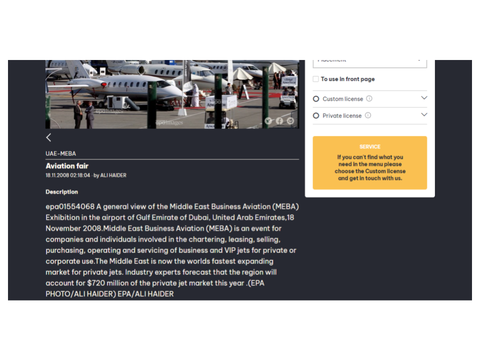 La leyenda que acompaña la foto original dice: “Vista general de la exposición Middle East Business Aviation (MEBA) en el aeropuerto del Emirato del Golfo de Dubai Emiratos Árabes Unidos, 18 de noviembre de 2008. Middle East Business Aviation (MEBA) es un evento para empresas e individuos involucrados en el fletamento, arrendamiento, venta, compra, operación y mantenimiento de jets comerciales y VIP para uso privado o corporativo. Oriente Medio es ahora el mercado de jets privados de más rápida expansión en el mundo. Los expertos de la industria pronostican que la región representará 720 millones de dólares del mercado de aviones privados este año. (Foto EPA / Ali Haider)”.