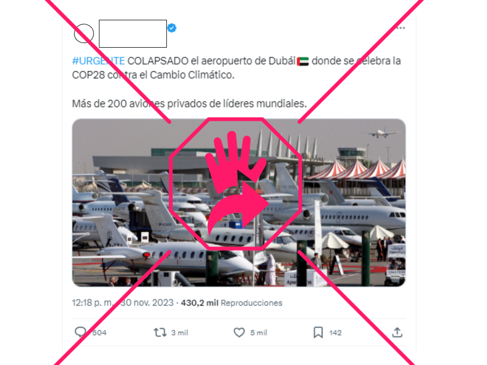 Circula en X (anteriormente Twitter) una publicación con la afirmación: “#Urgente Colapsado el aeropuerto de Dubái donde se celebra la COP28 contra el Cambio Climático. Más de 200 aviones privados de líderes mundiales”, acompañada de una foto en la que se ve poco más de una decena de aviones (no 200) estacionados.