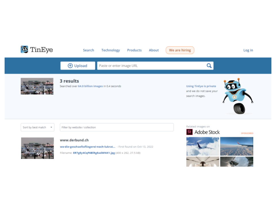En TinEye, la búsqueda inversa de imágenes arrojó tres resultados directos a la página del periódico suizo Der Bund. Allí, en un artículo de 2012, hacen uso de la foto que estamos verificando (es la cuarta de la galería) para destacar el auge de la aviación privada. En la leyenda, en alemán, se lee: “Donde actualmente están en auge los vuelos en jets privados: feria de aviación de negocios en Dubai. (Foto de archivo 2008)”.