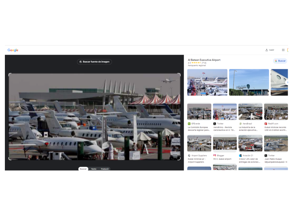 Entre los resultados de la búsqueda en Google Lens está una nota de la agencia EFE del 1° de junio de 2023 en la que aparece la misma imagen que, según señala, es de archivo y corresponde a una “vista general del Salón de la Aviación de Oriente Medio, montado en el aeropuerto de Dubai”. Precisa que su autor es “Ali Haier”.