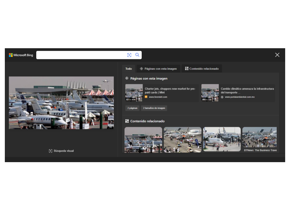 Confirmamos el origen de la foto con una búsqueda inversa de imágenes en Bing Images, TinEye y Google Lens, que nos dio detalles para dar con la foto original de archivo, publicada por la EPA Images en 2008 en el marco de la exposición Middle East Business Aviation en Dubai.