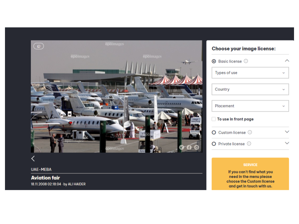 En el archivo fotográfico de EPA Images hallamos, con palabras clave en inglés (aviation business fair in Dubai), la imagen que estamos verificando con una descripción que indica que fue tomada por el fotógrafo Ali Haider, el 18 de noviembre de 2008 (hace 15 años), en la exposición Middle East Business Aviation, en Dubai.