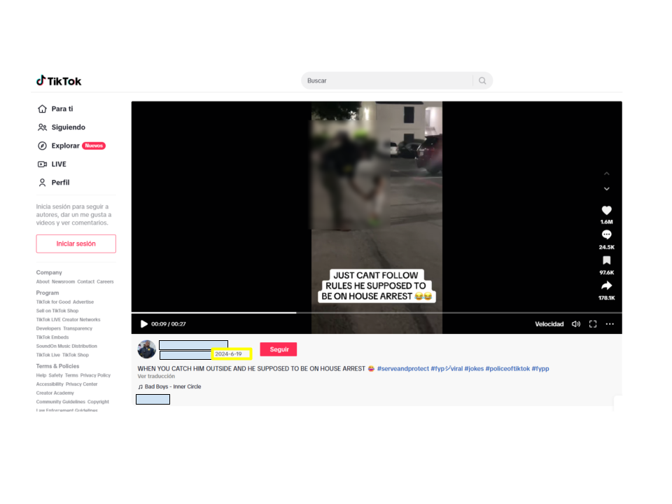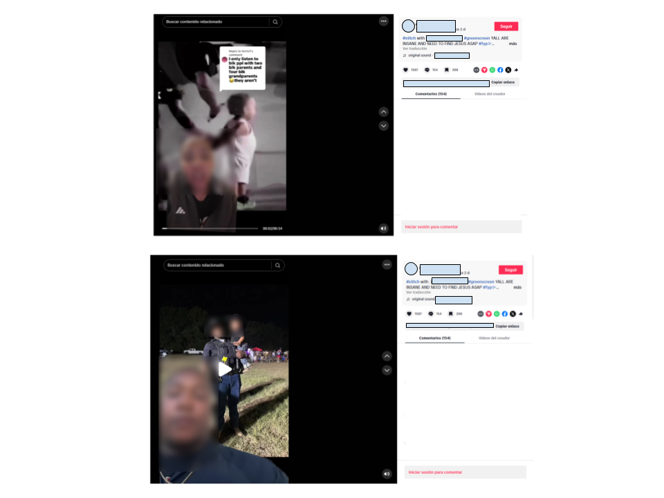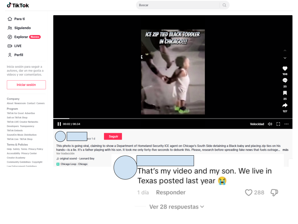 En la cuenta de este usuario, hay otros videos haciendo referencia a la falsa afirmación de que las imágenes son de la detención por parte de agentes migratorios de un niño. Uno de ellos muestra a una mujer describiendo la supuesta redada, y el hombre dueño del perfil y del video original se ríe y dice: “Simplemente nos gusta jugar a policías y ladrones”. Esa respuesta la dio el lunes 6 de octubre de 2025, cuando se empezó a viralizar la imagen. Allí mismo, en la descripción, escribió: “Están locos y necesitan encontrar a Jesús lo más pronto posible”.