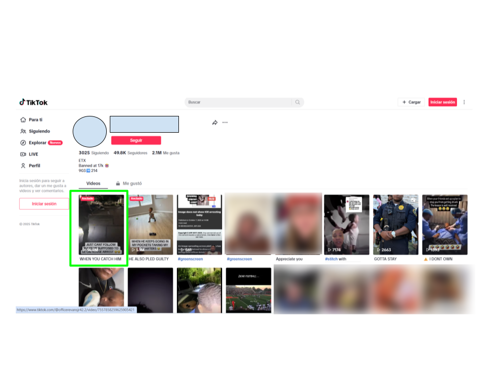 También revisamos el perfil de la persona que afirma ser el hombre que juega con el niño y, efectivamente, en su cuadrícula de TikTok tiene el video anclado, es decir fijado o destacado (ver cuadro verde) en la parte superior del mismo. El video original dice en su descripción: “Cuando lo atrapas fuera de su casa y se supone estaba en arresto domiciliario”.