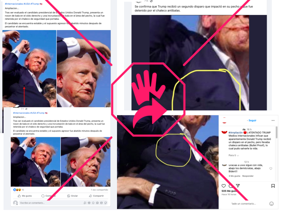 El texto de algunas de las publicaciones difundidas en redes sociales, junto a una imagen en la que se señala el supuesto agujero en la chaqueta del expresidente, afirma: “Tras ser evaluado el candidato presidencial de Estados Unidos Donald Trump, presenta un roson [sic] de bala en el oído derecho y una incrustación de bala en el área del pecho, la cual fue retenida por el chaleco de seguridad que portaba”. Mientras que en otra se lee: “Se confirma que Trump recibió un segundo disparo que impactó en su pecho y que fue detenido por el chaleco antibalas”.