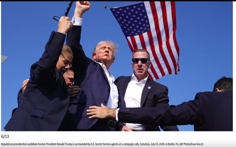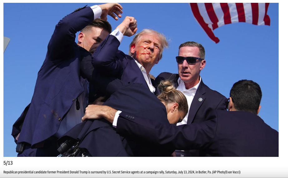 Además, en la sexta instantánea de la misma galería se puede ver al expresidente con el puño totalmente levantado y a la agente en una posición diferente, que permite observar completamente el lado superior derecho del torso y la chaqueta de Trump sin ningún agujero. También fue captada por el lente de Evan Vucci.