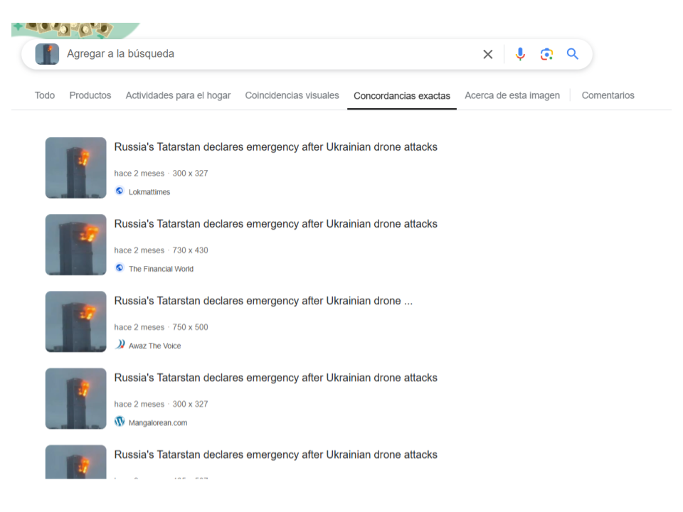 Ya con el dato de que en diciembre de 2024, específicamente entre el 21 y 22 de diciembre, hubo un ataque con drones que envió Ucrania a Rusia, hicimos una búsqueda con palabras clave en Google, en inglés y español. Con los resultados confirmamos que el origen de la foto, efectivamente corresponde al ataque con drones de diciembre de 2024, y no es de una “ofensiva ucraniana con aviones no tripulados” de “última hora”, como se lee en redes sociales.