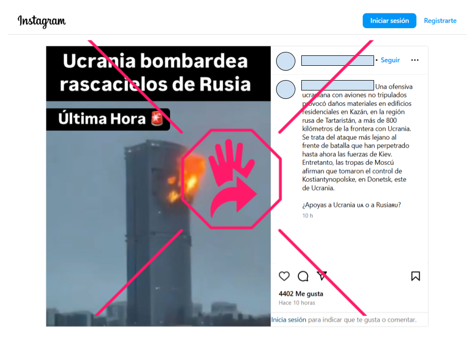 “Última hora. Ucrania bombardea rascacielos de Rusia”, se lee en un texto superpuesto en una fotografía que circula en redes sociales en marzo de 2025, en la que se ve un edificio muy alto, de color gris, con llamas saliendo de él. Es falso que corresponda a una ofensiva ucraniana de “última hora”, como afirman en Instagram. La imagen está fuera de contexto, porque el hecho ocurrió en diciembre de 2024.
