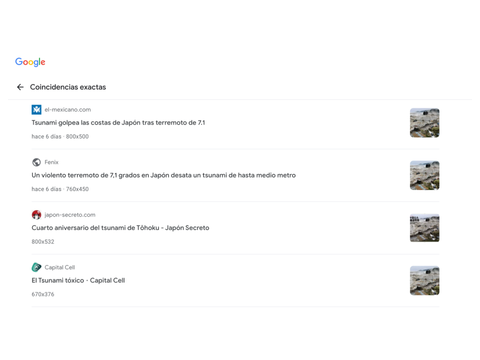 Una nueva búsqueda en Google, esta vez utilizando palabras clave, facilita otras publicaciones que ubican la fotografía en esa localización y en esa fecha, y no en Miyazaki y otras zonas, como falsamente afirman en redes sociales.