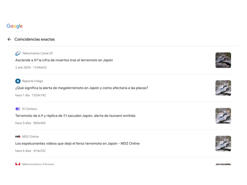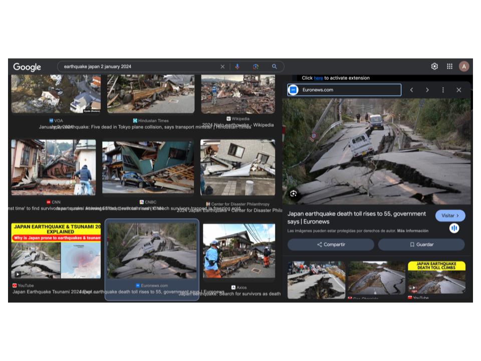 En cuanto a la segunda imagen, la de los automóviles en una carretera agrietada por varias partes, una búsqueda inversa de la imagen en Google Lens indica que la foto se tomó después del terremoto del 1 de enero de este año, igualmente en Japón. Al hacer también una pequeña investigación en Google utilizando palabras clave hallamos que la imagen fue hecha por Hiro Komae, para la agencia de noticias estadounidense AP.