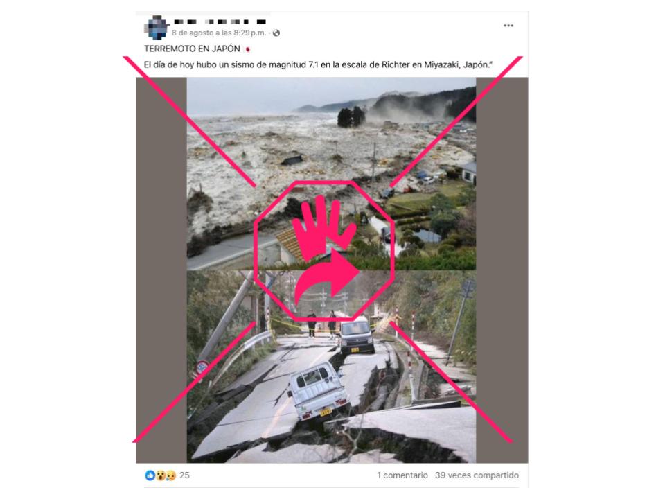 “El día de hoy hubo un sismo de magnitud 7.1 en la escala de Richter en Miyazaki, Japón”, dice el post que acompaña a las imágenes. En la de la parte superior se ve cómo una ola de escombro se acerca a una zona con dos casas con jardín. En la de la parte inferior se ve una carretera agrietada en varias partes y dos automóviles en parte hundidos en esos huecos, mientras dos personas observan la situación desde el fondo. Las dos fotos no son del terremoto del 8 de agosto de 2024. Tampoco son de la zona donde ocurrió el reciente sismo, en la parte sur de Japón, que es donde se encuentra la prefectura de Miyazaki.