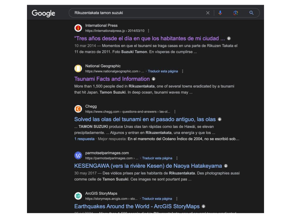 Una búsqueda inversa de imágenes en Google Lens con una captura de la foto superior, en la que se aprecia una ola de escombros cercando los jardines de dos viviendas, da entre sus resultados una web en la que datan la fecha de la fotografía el 11 de marzo de 2011, en Tohoku. Esa fecha es la del terremoto y posterior tsunami que arrasó la costa japonesa en la zona de Fukushima, una de las prefecturas de Tohoku, y que causó el accidente del reactor nuclear de esa localidad.