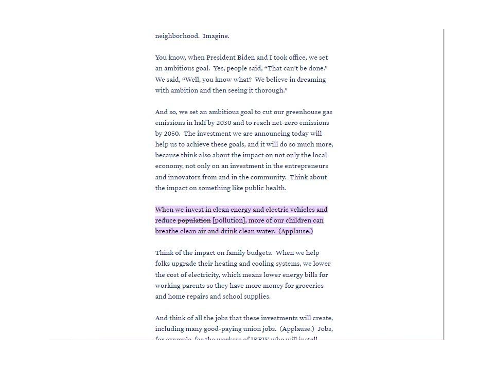 En ese momento, la vicepresidenta continuó hablando con normalidad, sin embargo al buscar la transcripción del evento en la web de la Casa Blanca, encontramos que lo que iba a decir Harris era ”reducimos la contaminación” y no “reducimos la población”, como lo hizo. En la transcripción la palabra población aparece tachada y contaminación aparece entre corchetes a manera de aclaratoria.