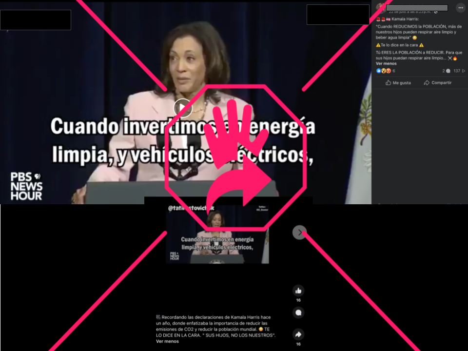En el video que circula en Facebook Harris aparece diciendo: “Cuando invertimos en energía limpia y vehículos eléctricos y reducimos la población, más niños podrán respirar aire limpio y beber agua limpia”. Después se repite el fragmento en donde dice “reducimos la población”, pero en cámara lenta.