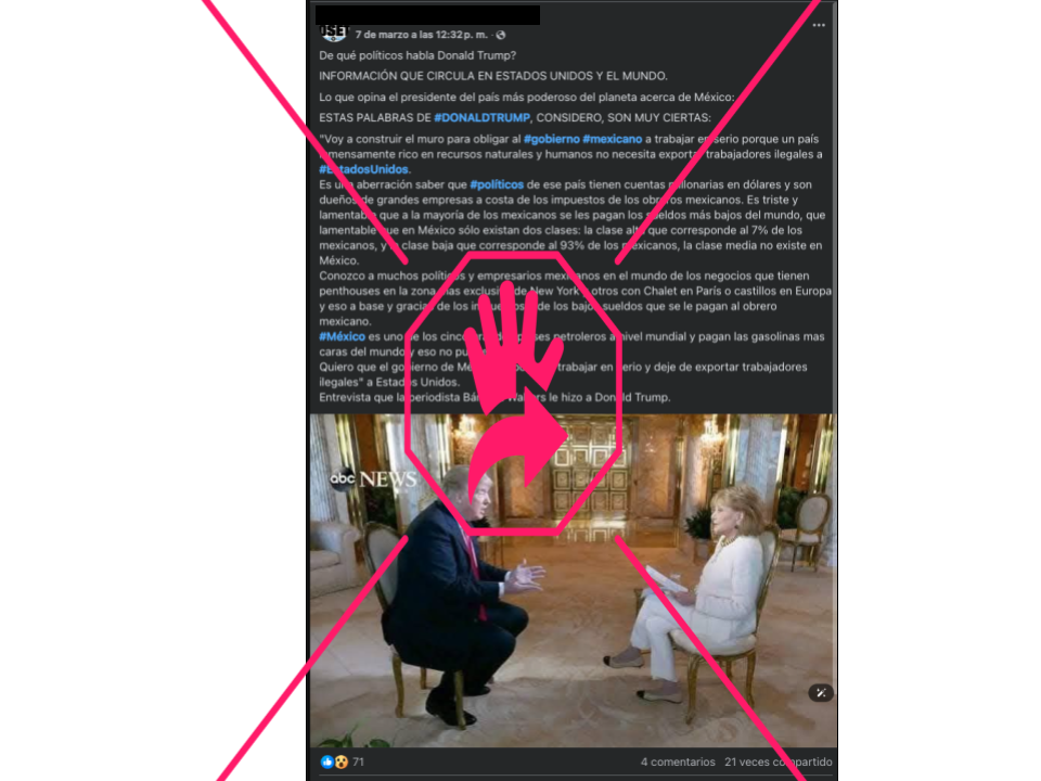 Publicaciones compartidas en Facebook aseguran que el presidente Donald Trump hizo varias declaraciones sobre México durante una entrevista con la periodista Barbara Walters, como por ejemplo que construiría un muro para forzar al gobierno mexicano “a trabajar en serio” para que dejara de “exportar trabajadores ilegales a Estados Unidos” o que no existía la clase media en ese país, pero esas supuestas afirmaciones son falsas. En la entrevista, que tuvo lugar hace casi 10 años, el mandatario no dijo eso que le atribuyen en marzo de 2025.
