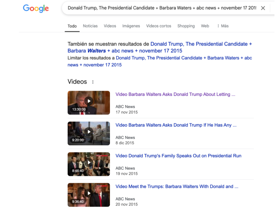 La misma búsqueda arrojó otros resultados de la misma entrevista en el portal de ABC News y en el canal de YouTube del medio, y en ambos casos el video se titula en inglés: “Donald Trump, el candidato presidencial”.
