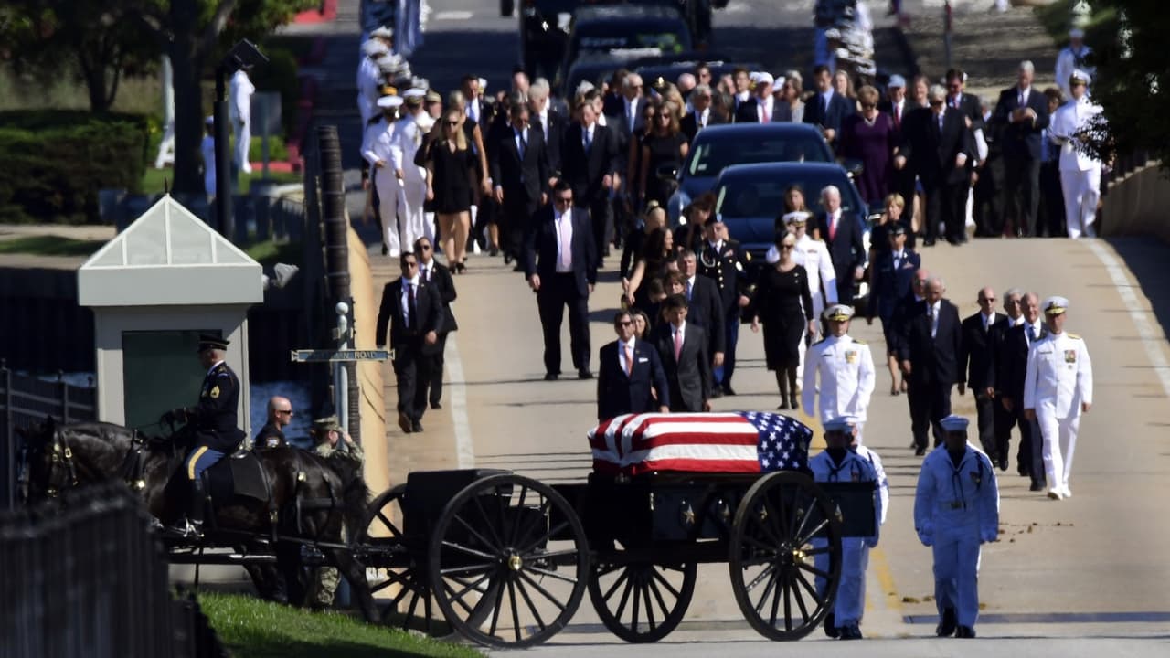 Mientras la carroza que transportaba al senador pasó por una verja e ingresó a la academia, varios cientos de personas en la calle en un cálido y húmedo día veraniego emitieron un sonoro aplauso. Muchas tenían una mano sobre el corazón y ondeaban banderas estadounidenses, algunas gritaron "Dios te bendiga".