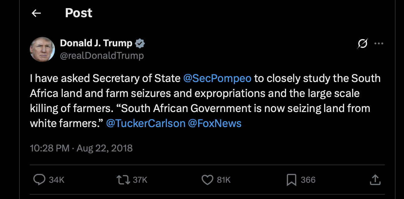 No es la primera vez que Trump impulsa esa narrativa. En 2018, durante su primer mandato, publicó en su cuenta de X (antes Twitter) que había “asesinatos a gran escala de agricultores” y que el gobierno sudafricano estaba expropiando tierras a granjeros blancos, una declaración desmentida por las autoridades sudafricanas en ese momento. Elon Musk, empresario nacido en Sudáfrica y asesor de Trump, también ha respaldado la idea de un genocidio.