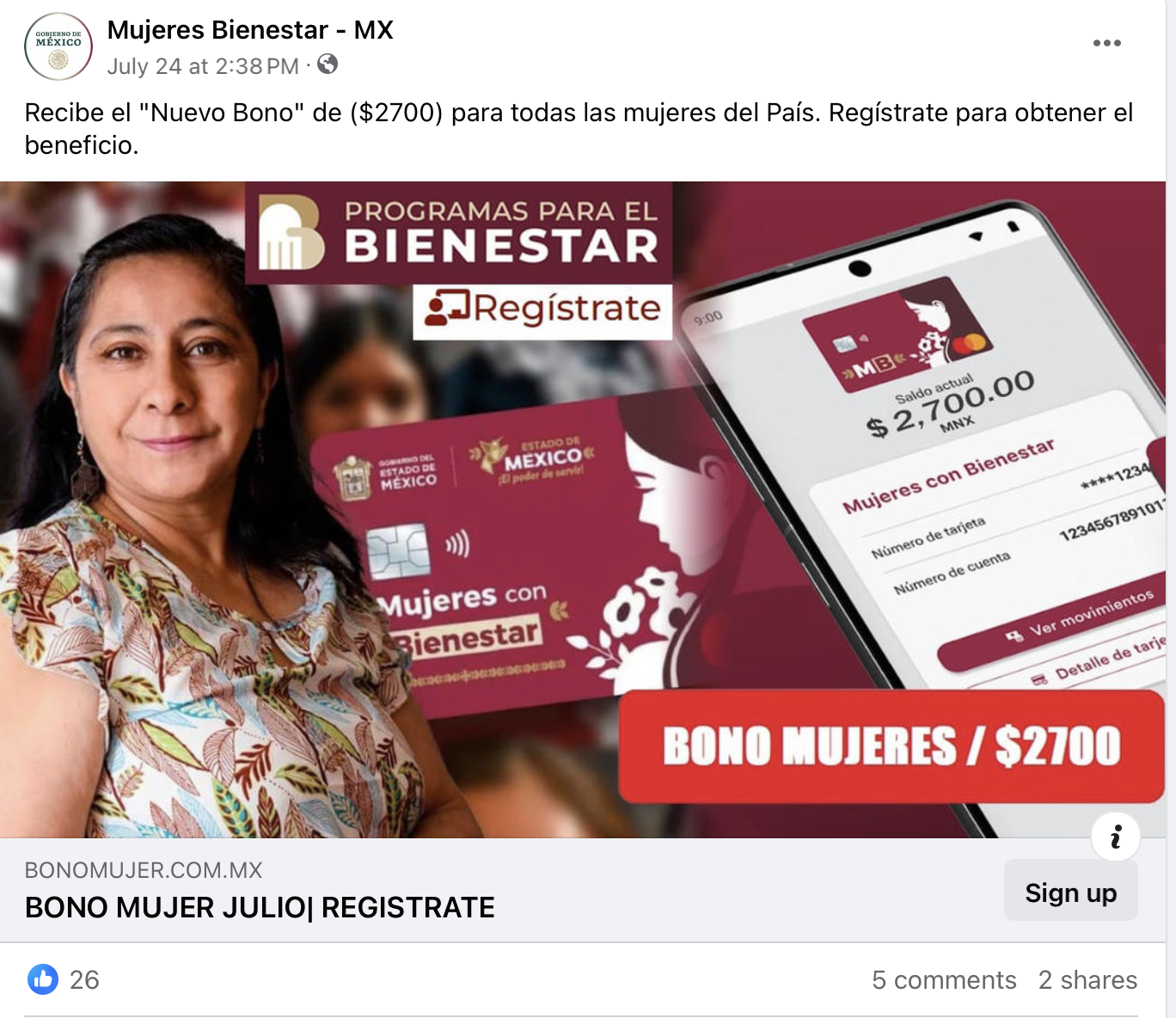 “Ya es oficial! Se entrega el nuevo ‘Bono Mujer’ de $3,000 MXN [161.10 dólares]” dice la publicación, en la que se muestra una tarjeta con el logo del Estado de México y el enunciado "Mujeres con Bienestar". El post, publicado el 14 de agosto de 2024, también asegura que este beneficio será otorgado a “todas las madres de familia” y solicita registrarse para obtenerlo.
