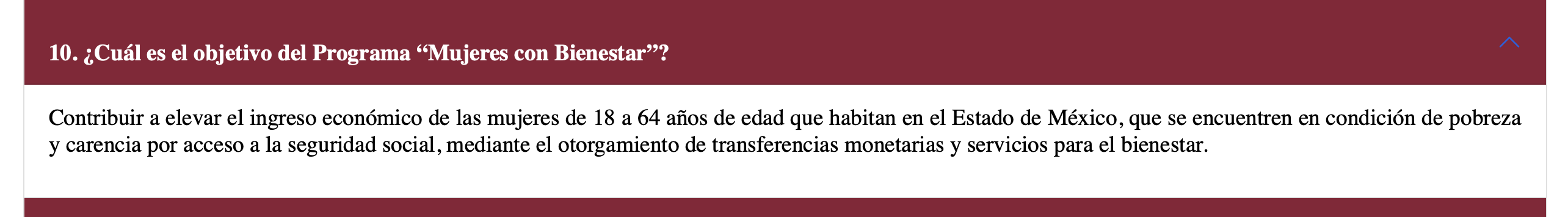 Mujeres con Bienestar está dirigido a mujeres de 18 a 64 años que residen en el Estado de México y que se encuentran en “pobreza y carencia por acceso a la seguridad social”, el apoyo monetario es de “$2,500.00 MXN [133.14 dólares] (dos mil quinientos pesos), bimestrales de acuerdo a la disponibilidad presupuestal autorizada”.