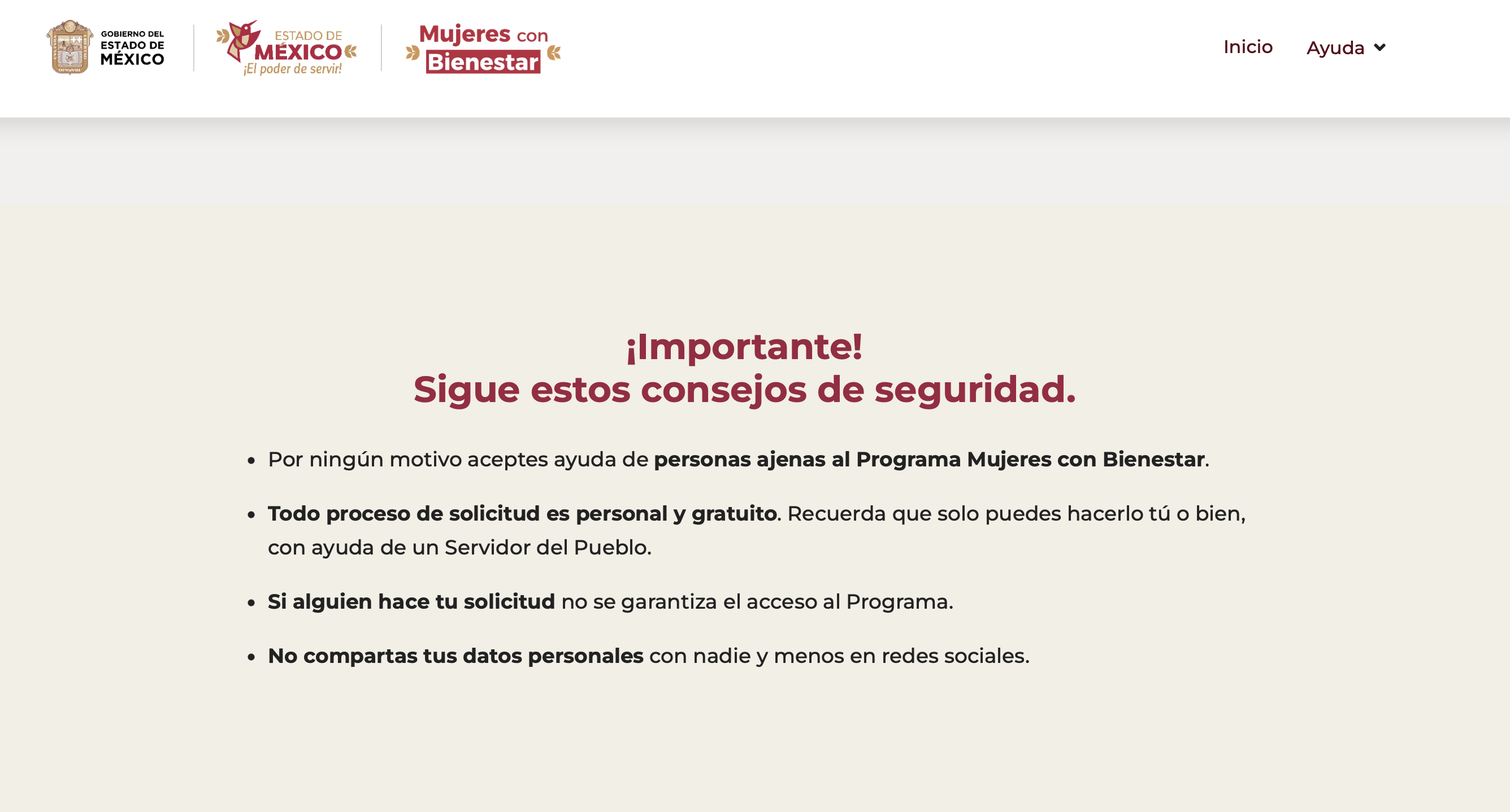 El sitio web del Gobierno del Estado de México advierte no aceptar ayuda de personas ajenas al Programa Mujeres con Bienestar y recomienda no compartir datos personales con nadie, ni en redes sociales. Además, señala que todo proceso de solicitud es personal y gratuito.