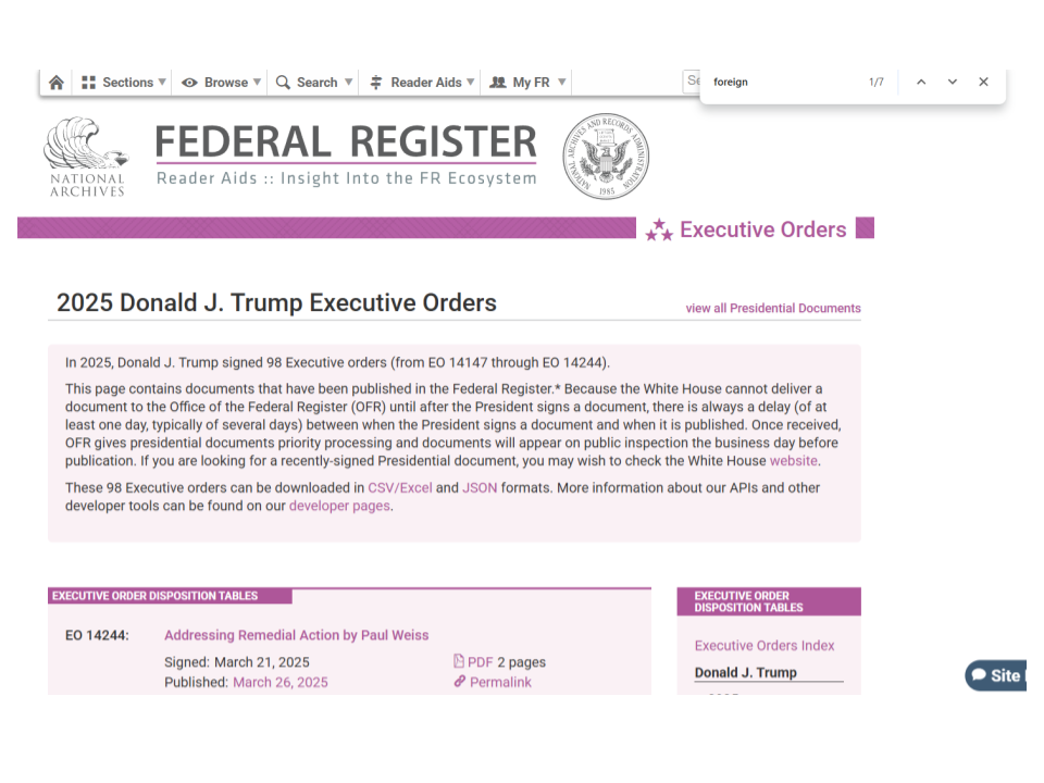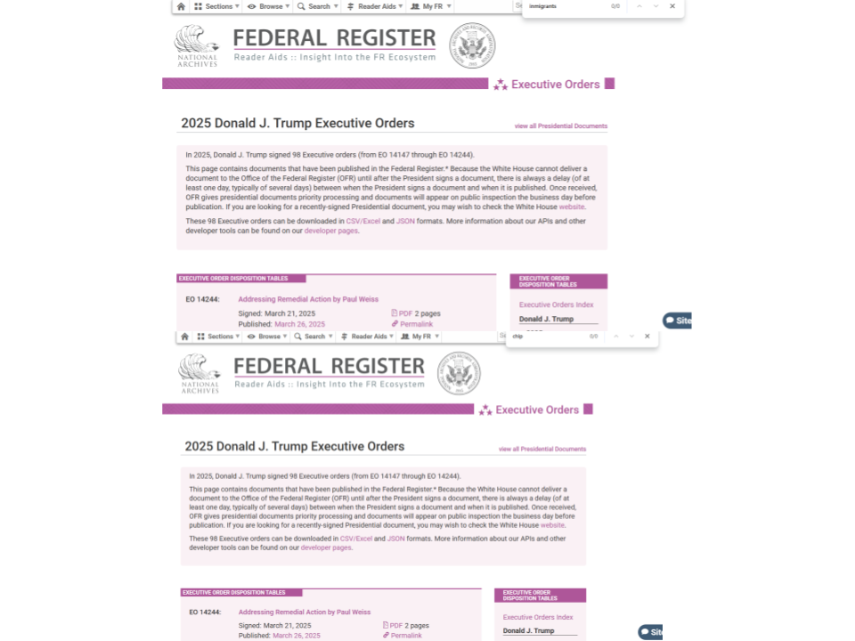 Desde elDetector hicimos una revisión a las acciones presidenciales de Trump, publicadas desde el 20 de enero de 2025 y actualizadas a diario, en la página web de la Casa Blanca. No hay ninguna orden ejecutiva, memorando o proclamación que se refiera a la “implantación” de un chip, o que mencione implantes a los inmigrantes. En la página web del Registro Federal, actualizada con las órdenes presidenciales all 24 de marzo de 2025, tampoco hay registro de alguna medida que mencione los supuestos chips, o algo específico con inmigrantes.