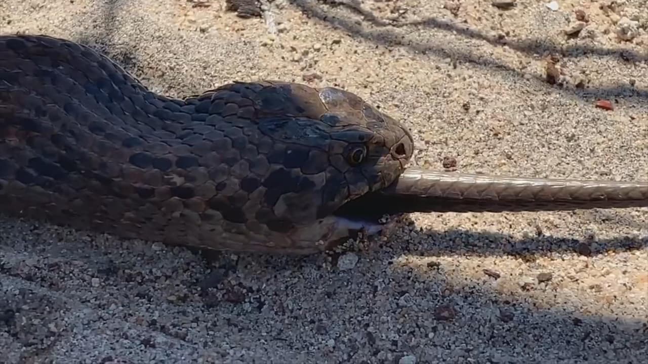 Brett Butler estaba dando un paseo en Ocean Creek, en Australia, cuando se encontró con esta enorme serpiente en medio de un banquete. Butler dijo que la serpiente era una especie venenosa de aproximadamente de 4.5 pies de longitud.