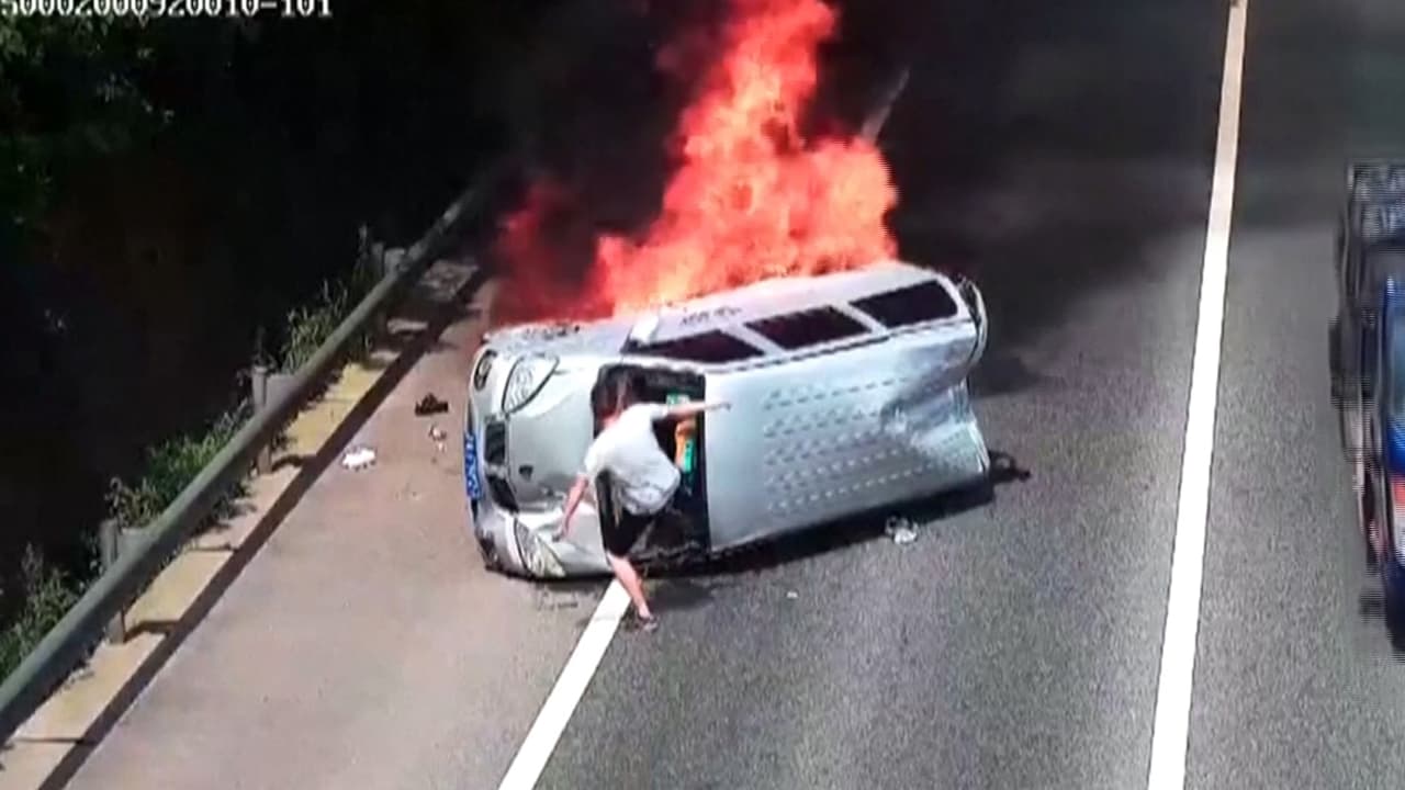 Graban el momento en que un hombre salva a los pasajeros de un auto en llamas que perdió el control