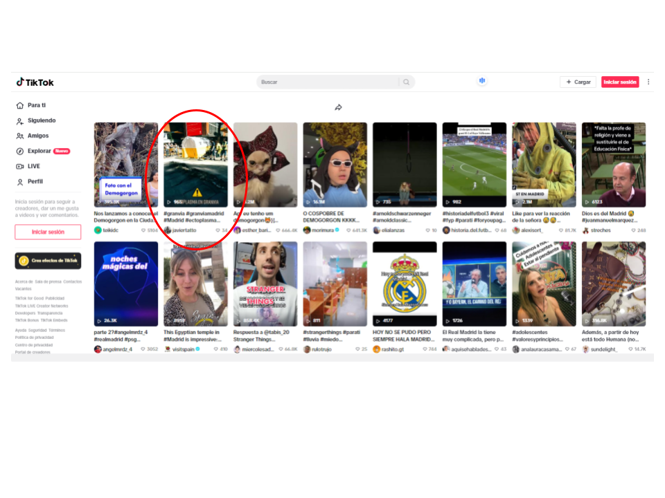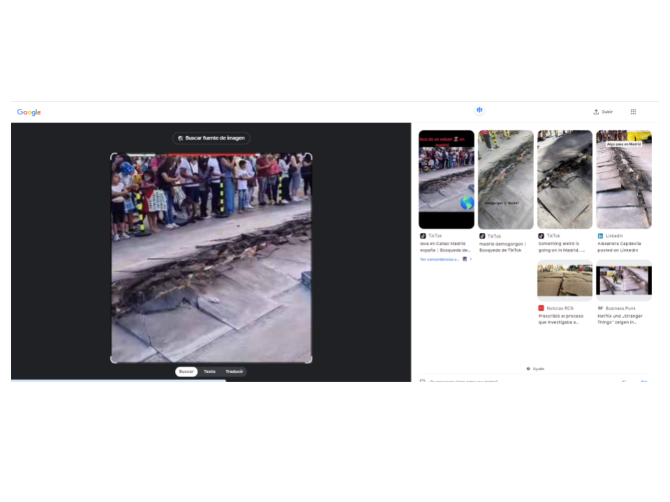 Con una captura de pantalla del video, hicimos una búsqueda inversa de imágenes en Google Lens. Los resultados nos llevaron a otras publicaciones en TikTok que muestran la misma grieta, desde diferentes ángulos o zonas de Madrid, bajo la etiqueta “StrangerThings”. Uno de los contenidos incluye la etiqueta #Demogorgon. Stranger Things es una serie de ciencia ficción y misterio creada para Netflix.