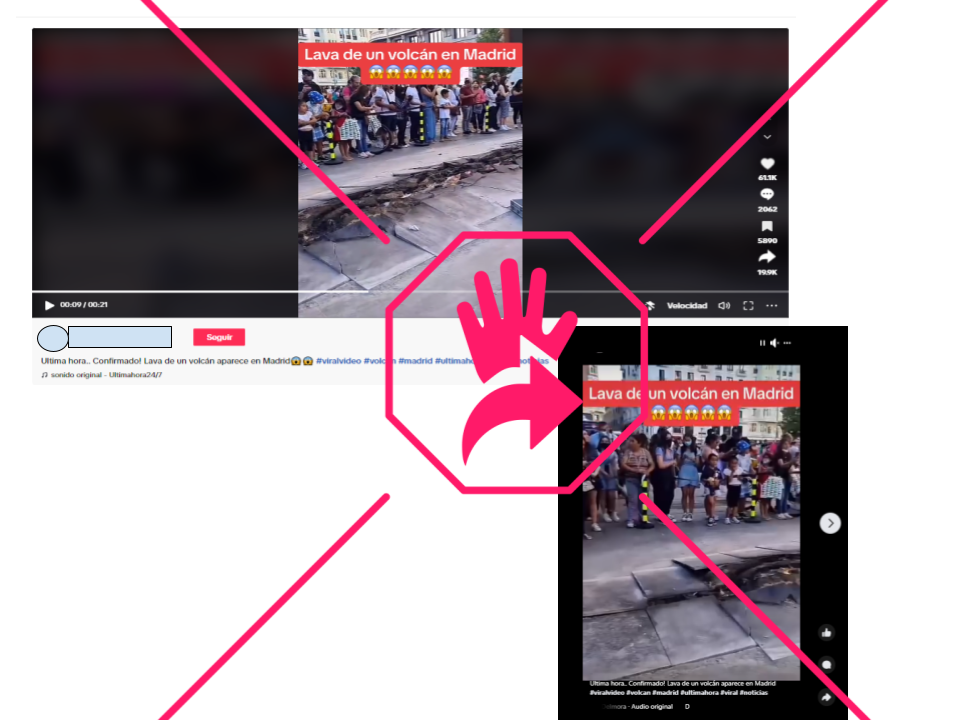 En el video de 21 segundos, que circula en TikTok y también en Facebook, se observa una grieta a lo largo de una calle. Las losas de cemento están levantadas, con rastros de haber sido quemadas. Hay gente que observa la grieta tras unas barandas. Al fondo, se ve una persona con un traje de protección amarillo que camina. La grabación está acompañada por la descripción: “Última hora…Confirmado! [sic] Lava de un volcán aparece en Madrid”. Pero es una falsedad.