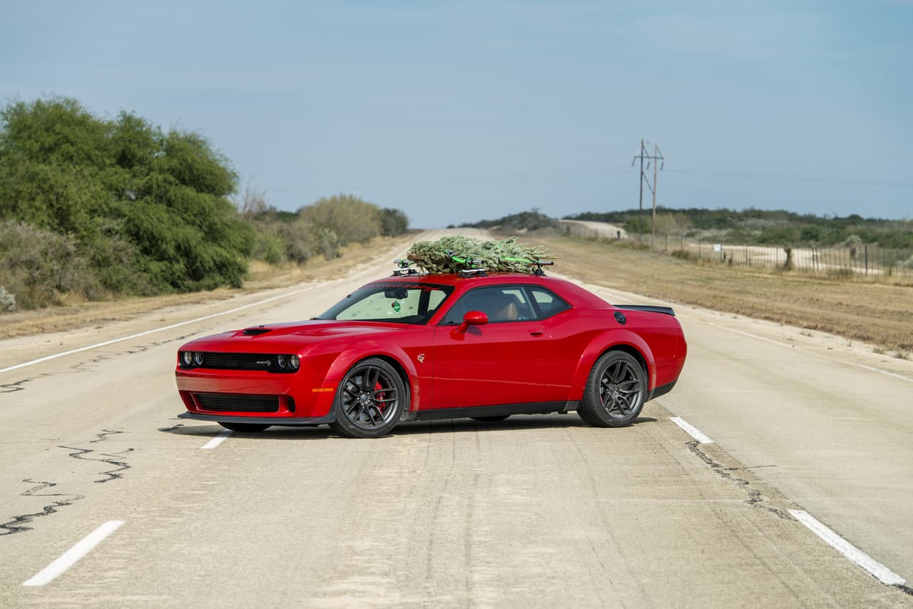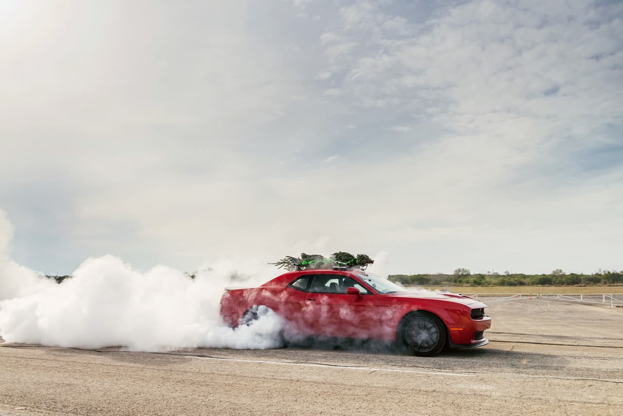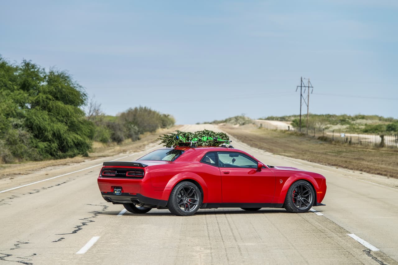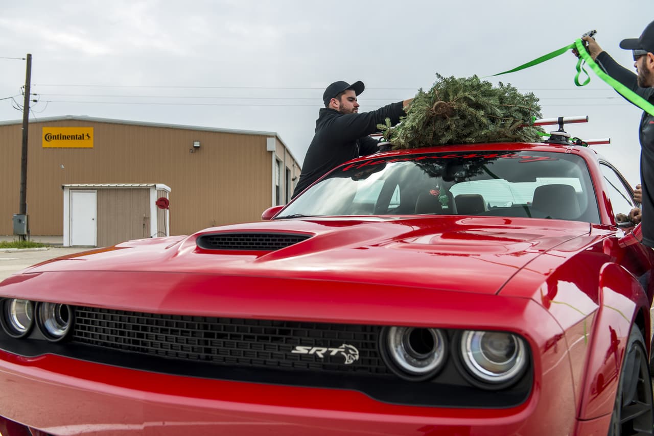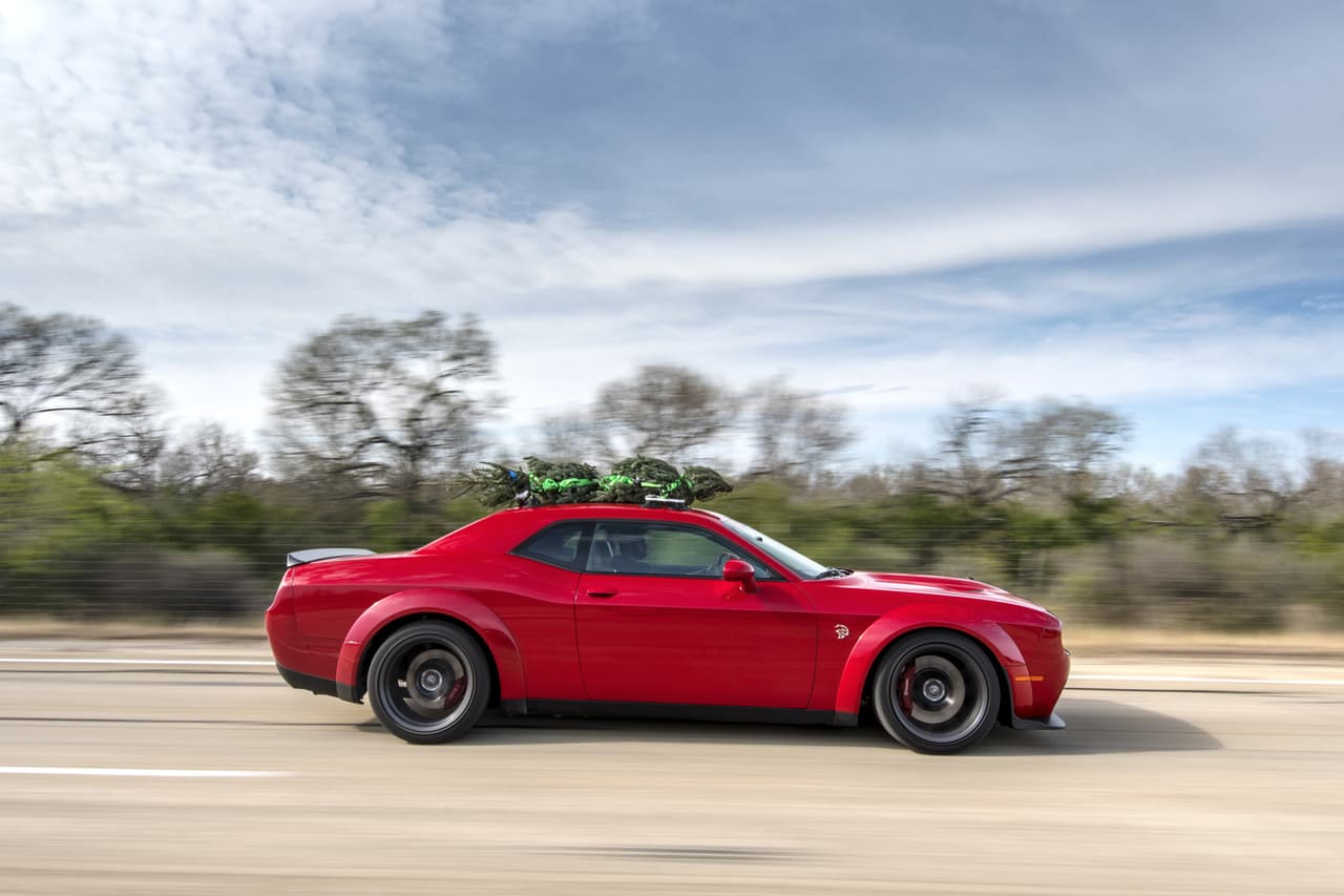 En este caso emplearon un Dodge Challenger SRT Hellcat Widebody de serie para llevar un árbol de navidad lo más rápido posible.