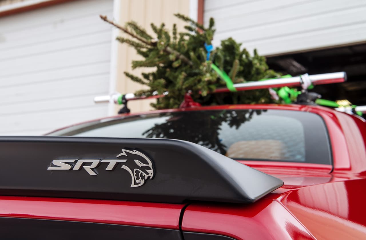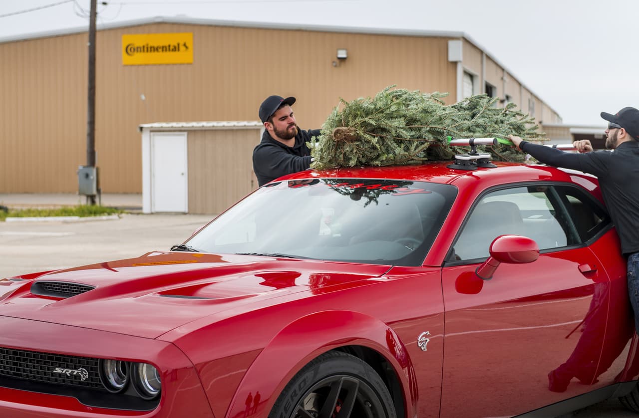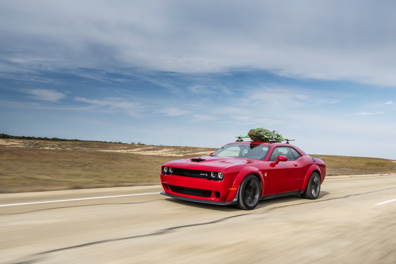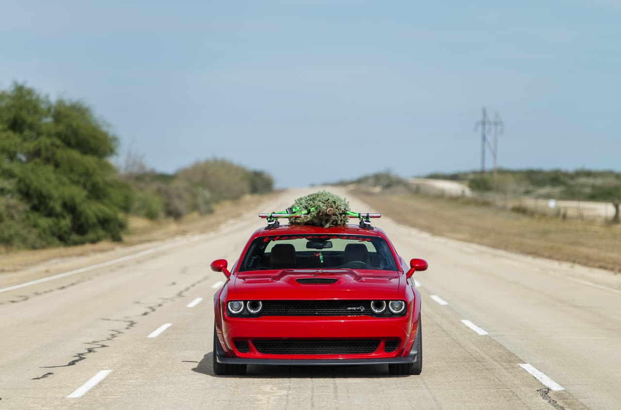 En este caso emplearon un Dodge Challenger SRT Hellcat Widebody de serie para llevar un árbol de navidad lo más rápido posible.