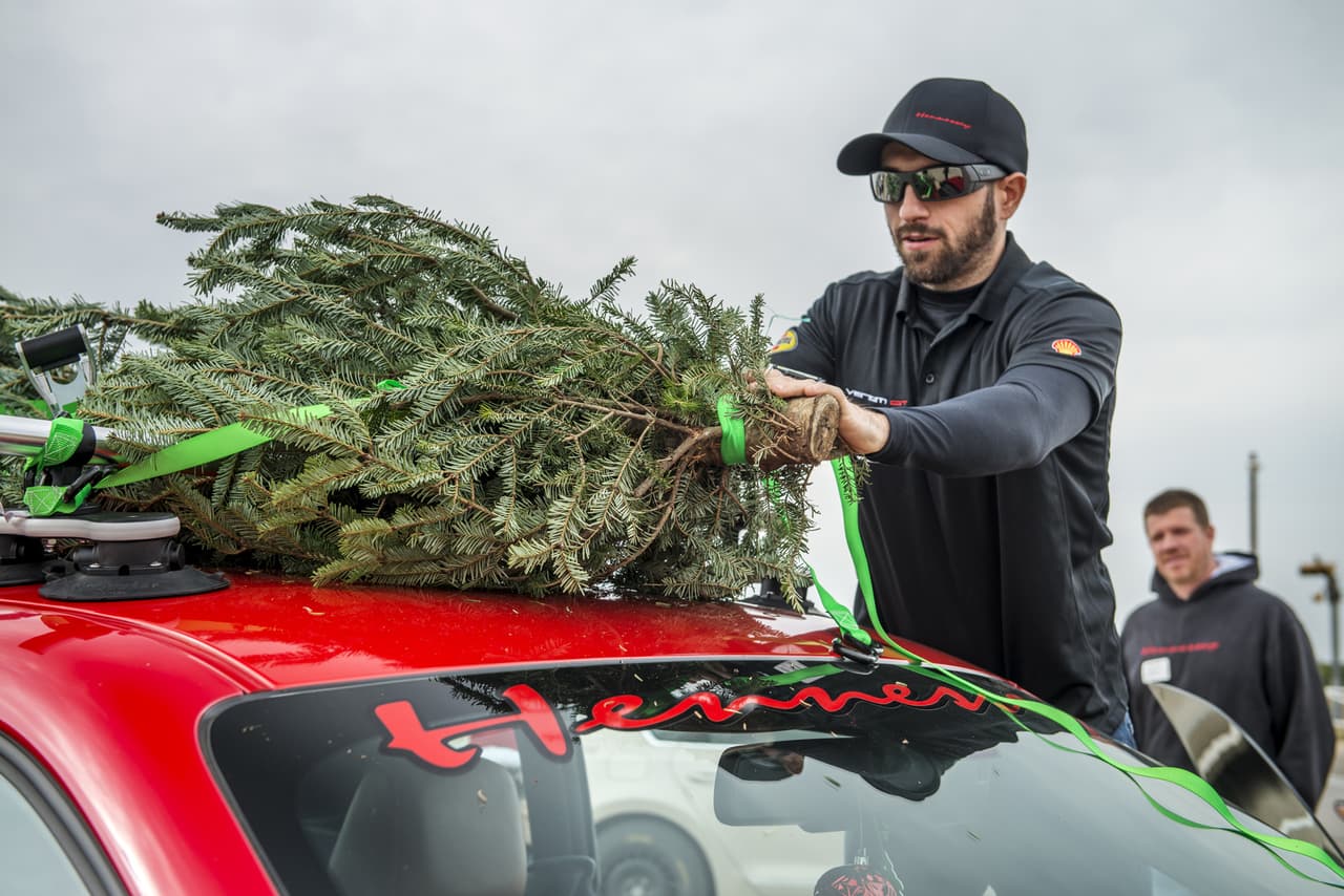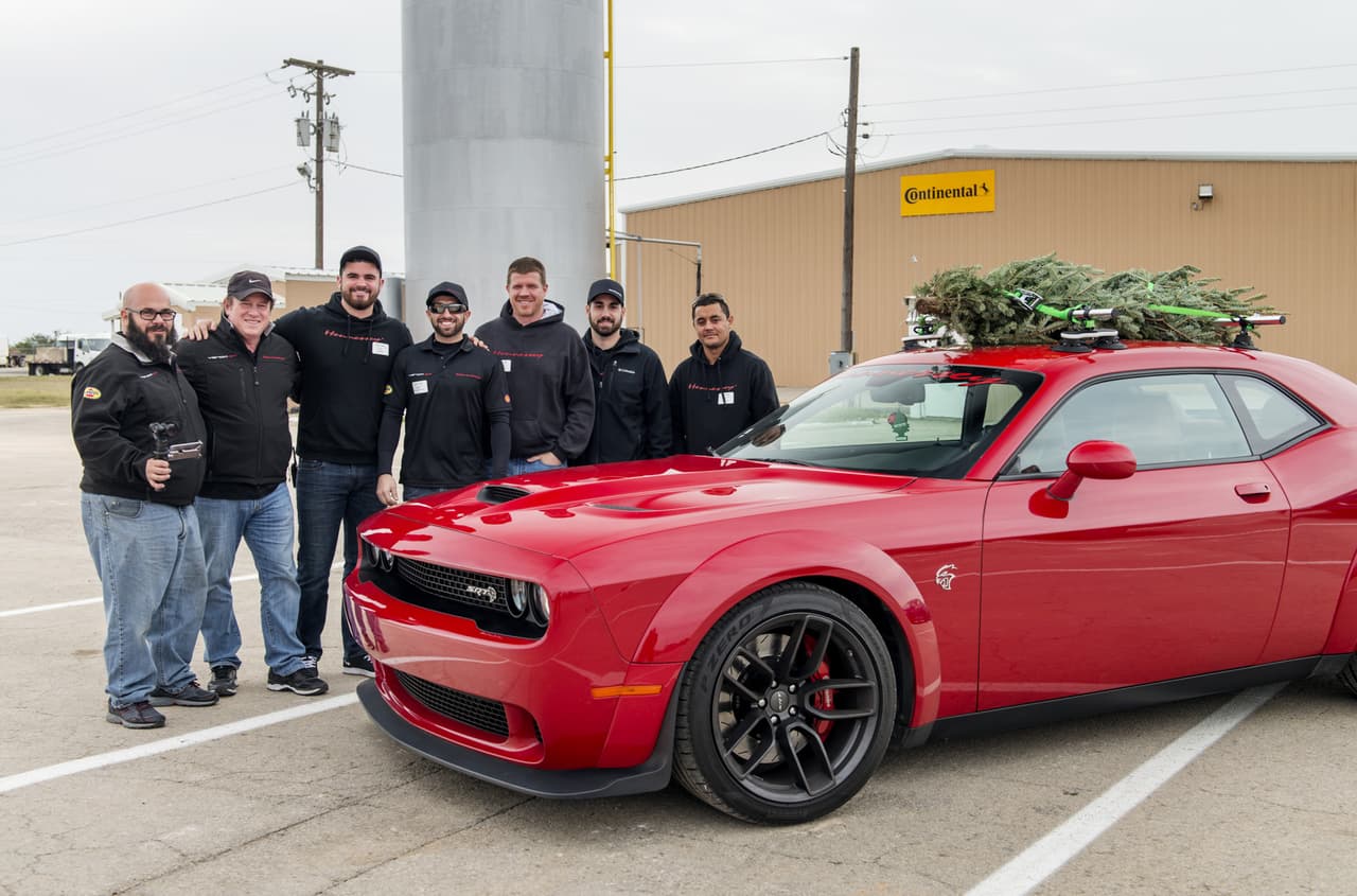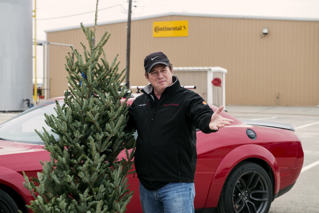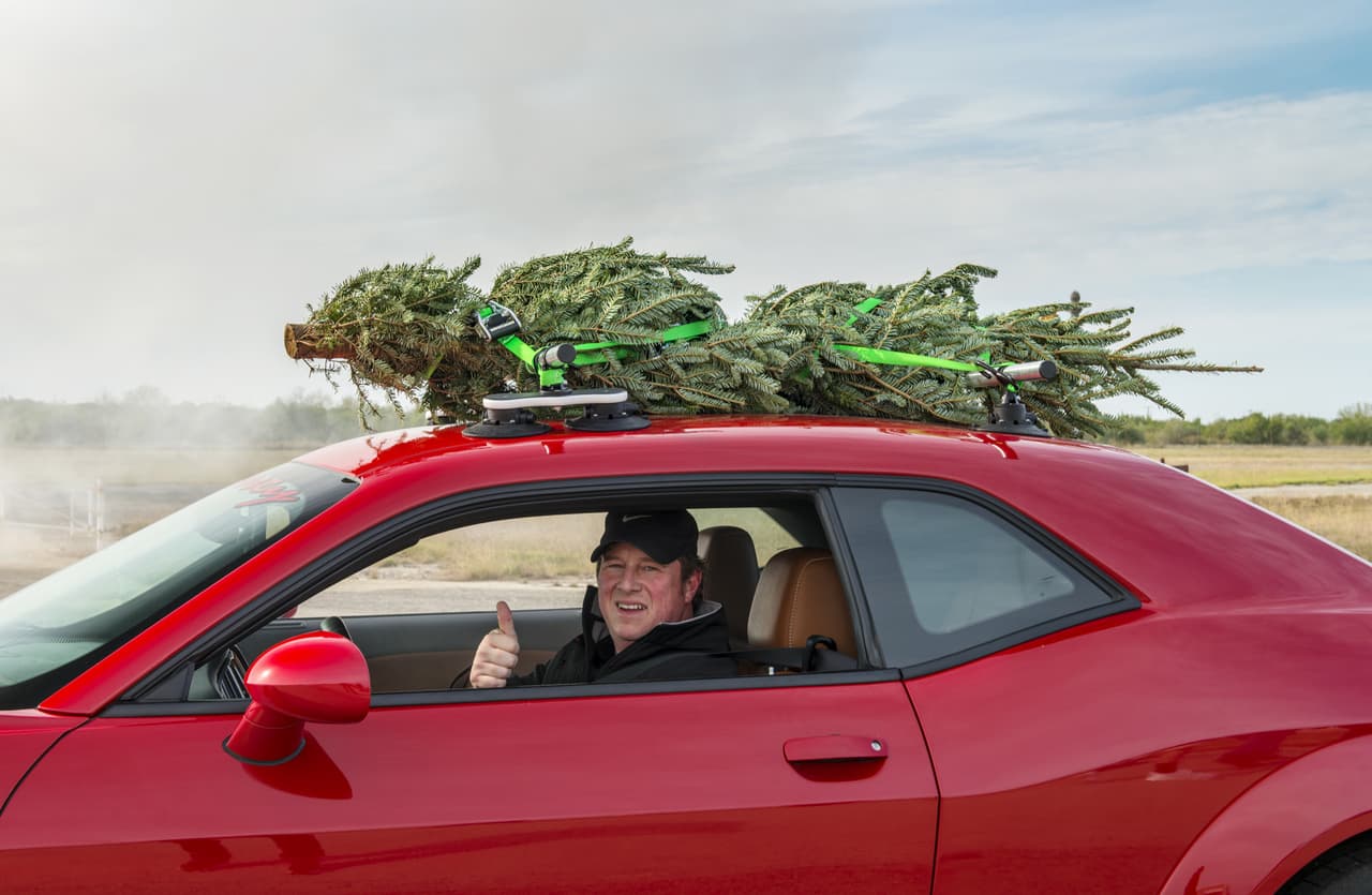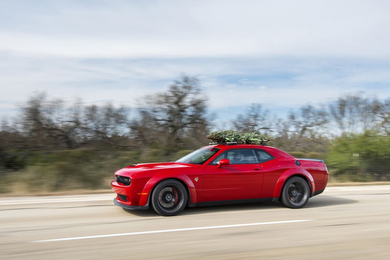 En este caso emplearon un Dodge Challenger SRT Hellcat Widebody de serie para llevar un árbol de navidad lo más rápido posible.
