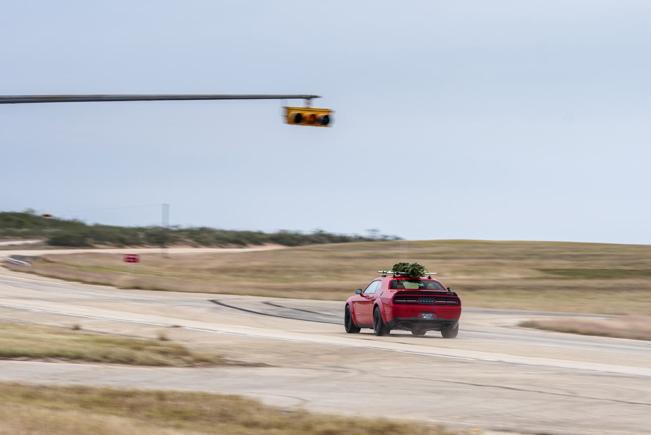 Con sus 707 HP el Challenger Hellcat consiguió alcanzar 174 mph (278 km/h) con el árbol en el techo. Una reducción total de 3 mph (4.8 km/h) frente a la capacidad real de velocidad máxima del auto sin “la decoración”.