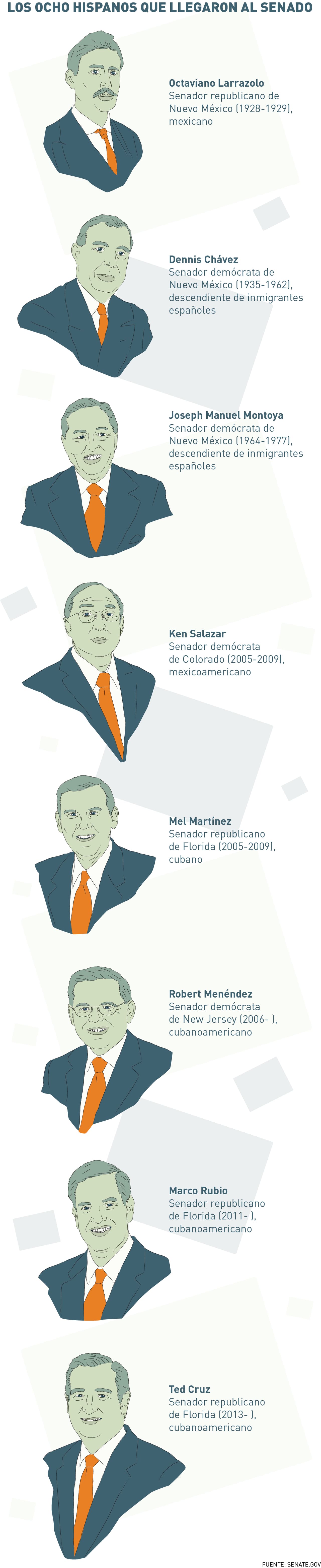 En las 100 bancas del Senado, al que cada estado envía dos legisladores, se han sentado apenas ocho hispanos. Todos hombres.