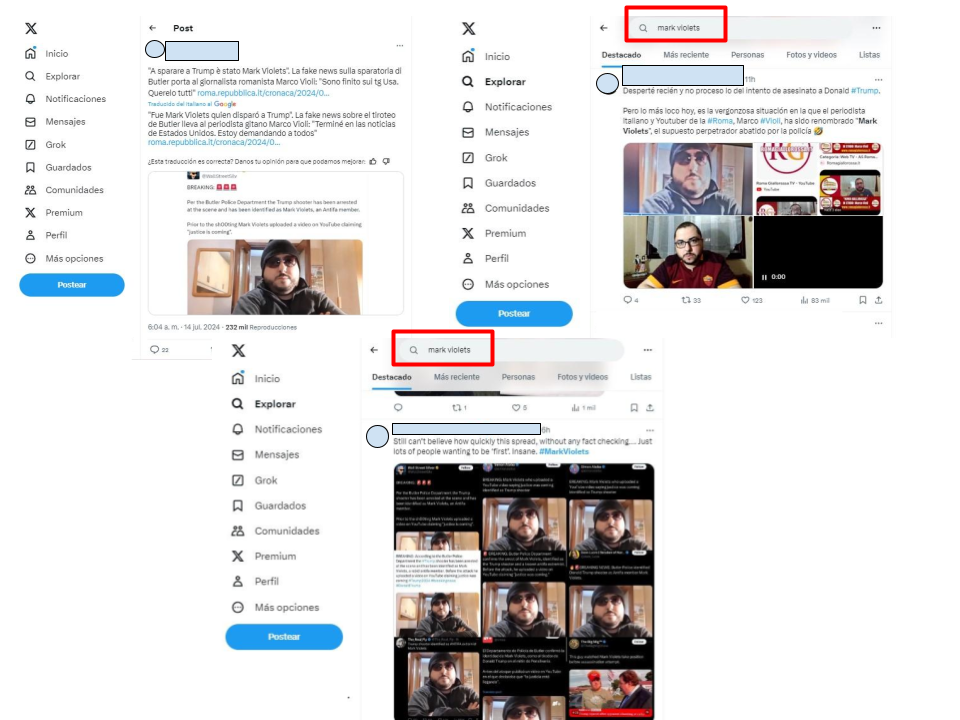 En una búsqueda en X con las palabras Mark Violets encontramos decenas de publicaciones, en italiano especialmente, que destacan que ese hombre con barba, pasamontañas y lentes no era el atacante del expresidente y candidato republicano, sino un divulgador de la AS Roma ( equipo de fútbol italiano) llamado Marco Violi (fonéticamente semejante a Mark Violets).