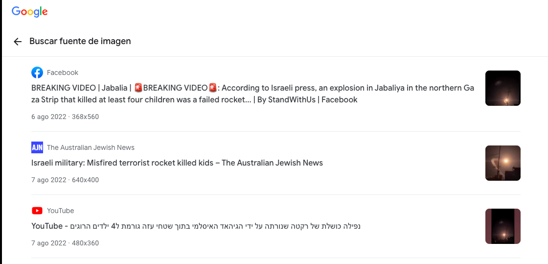 En elDetector realizamos una búsqueda inversa de imagen en Google que nos permitió encontrar varias publicaciones del 6 de agosto de 2022 en las que se pueden observar las mismas imágenes. En ellas, el video es atribuido a un misil supuestamente disparado desde Gaza que se desvió y ocasionó la muerte de varias personas en el campo de refugiados de Jabalia.